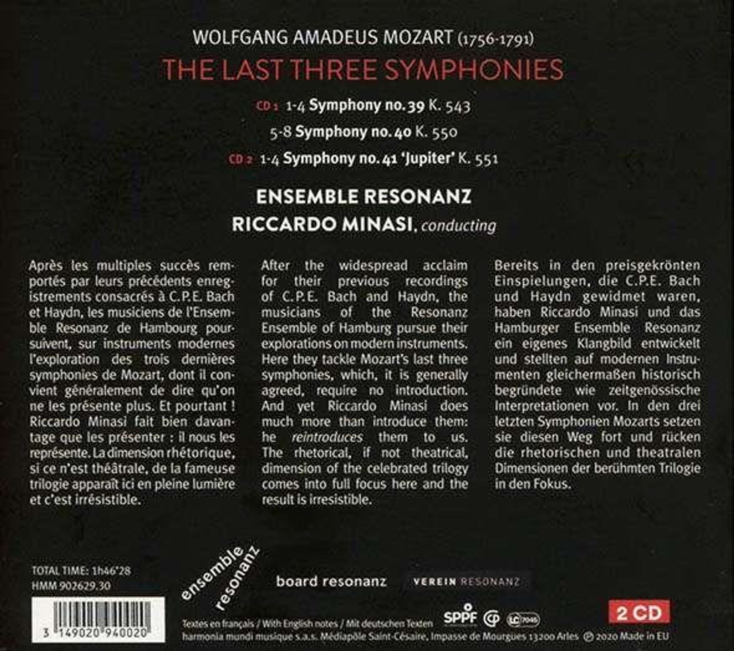 Bereits in den preisgekrönten Einspielungen, die C. P. E. Bach und Haydn gewidmet waren, haben Riccardo Minasi und das Hamburger Ensemble Resonanz ein eigenes Klangbild entwickelt und stellten auf modernen Instrumenten gleichermaßen historisch begründete wie zeitgenössische Interpretationen vor. In den drei letzten Sinfonien Mozarts setzen sie diesen Weg fort und rücken die rhetorischen und theatralen Dimensionen der berühmten Trilogie in den Fokus.