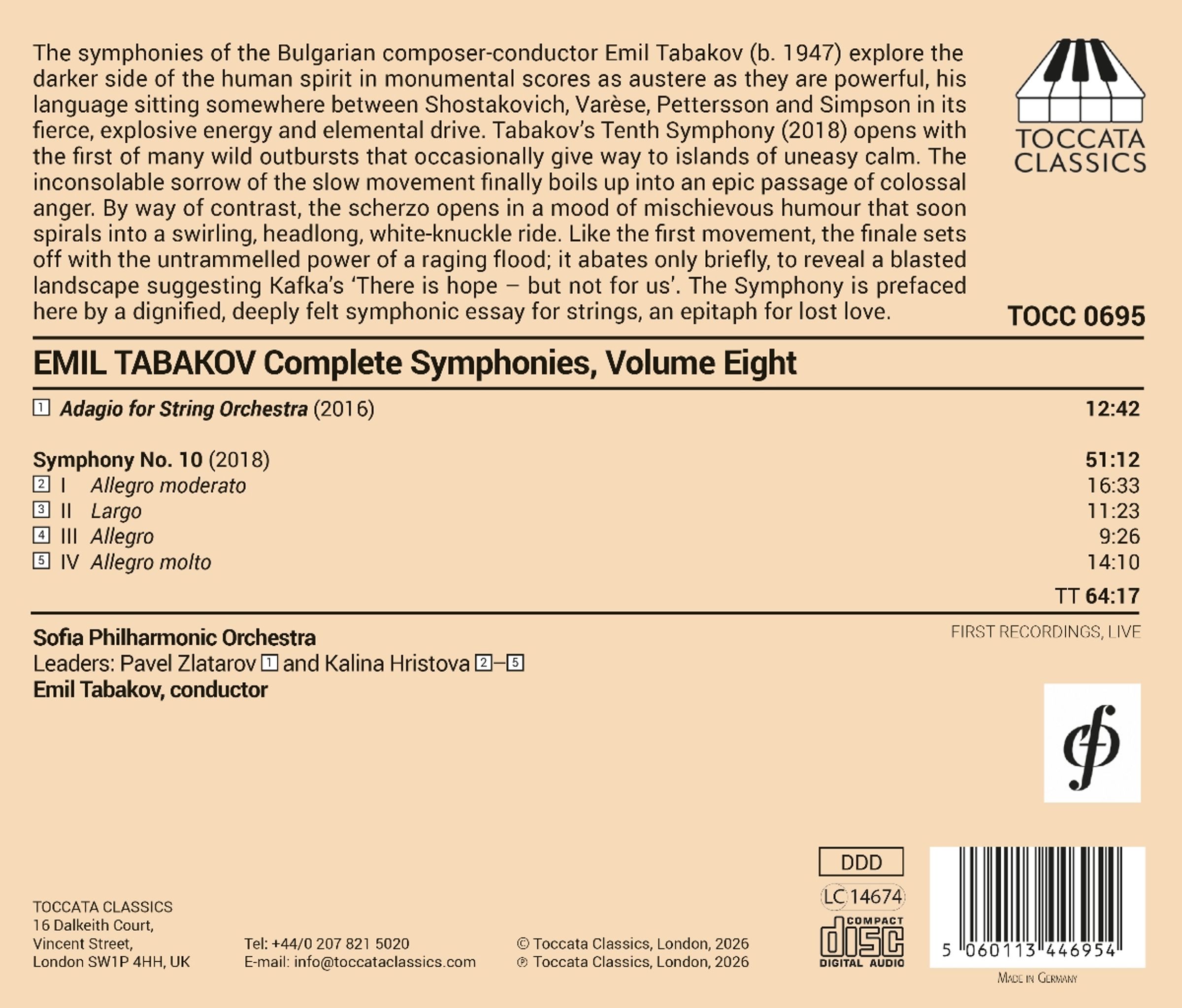 Die Sinfonien des bulgarischen Komponisten und Dirigenten Emil Tabakov erforschen die dunklere Seite der menschlichen Seele in monumentalen Partituren, die ebenso streng wie kraftvoll sind. Seine Sprache liegt mit ihrer wilden, explosiven Energie und elementaren Kraft irgendwo zwischen Dmitri Schostakowitsch, Edgard Varèse, Allan Pettersson und Robert Simpson. Seine zehnte Sinfonie (aus dem Jahr 2018) beginnt mit dem ersten von vielen wilden Ausbrüchen, die gelegentlich einer unruhigen Ruhe weichen. Die untröstliche Trauer des langsamen Satzes kocht schließlich zu einer epischen Passage kolossaler Wut hoch. Im Gegensatz dazu beginnt das Scherzo mit einer Stimmung schelmischen Humors, die sich bald zu einer wirbelnden, rasanten, nervenaufreibenden Fahrt entwickelt. Wie der erste Satz beginnt auch das Finale mit der ungezügelten Kraft einer tosenden Flut; sie lässt nur kurz nach, um eine verwüstete Landschaft zu enthüllen, die an Kafkas "Es gibt Hoffnung - aber nicht für uns" erinnert. Der Sinfonie geht eine feierliche, tief empfundene sinfonische Essay für Streicher, das "Adagio für Streichorchester" (2016) voraus, ein Epitaph für eine verlorene Liebe.