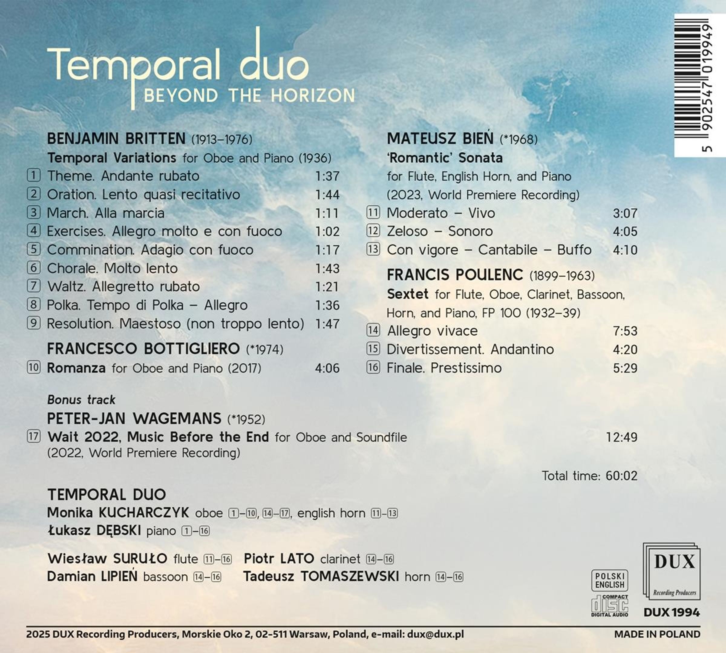 Die CD enthält Werke von fünf Komponisten, die im Laufe von fast 90 Jahren entstanden sind – von Werken Brittens und Poulencs aus der ersten Hälfte des 20. Jahrhunderts bis hin zu den neuesten Kompositionen von Michał Bienie und Peter-Jan Wagemans, die hier ihre phonografische Premiere feiern. Die vielfältigen Besetzungen der Blasinstrumente werden durch das Klavier zusammengehalten, das nur in der letzten Komposition digitalen Dateien weicht. Die Musik ist so farbenfroh wie die Blasinstrumente selbst. In ihre strenge, modernistische, über das Dur-Moll-System hinausgehende und manchmal sogar atonale harmonische Struktur sind verschiedene Motive eingewoben, die auf andere Genres und Stile verweisen. Man hört Anklänge an Filmmusik, Zirkusmusik, Jazz, romantische Pathos, Tanzrhythmen, aber auch tranceartigen Minimalismus. Die Interpreten sind Musiker, die mit der Musikakademie in Krakau verbunden sind und als Solisten, Kammermusiker und Mitglieder der besten Orchester Polens ein reges Konzertleben führen. In ihren Interpretationen stehen die perfekte Harmonie des Ensembles, die schöne Klangfarbe jedes einzelnen Instruments und die Aufmerksamkeit für die kleinsten Nuancen der Phrasierung im Vordergrund. Die CD zeigt das Potenzial der Blasinstrumente, die – sowohl solo als auch in verschiedenen Kombinationen – immer wieder neue Generationen von Künstlern faszinieren.
