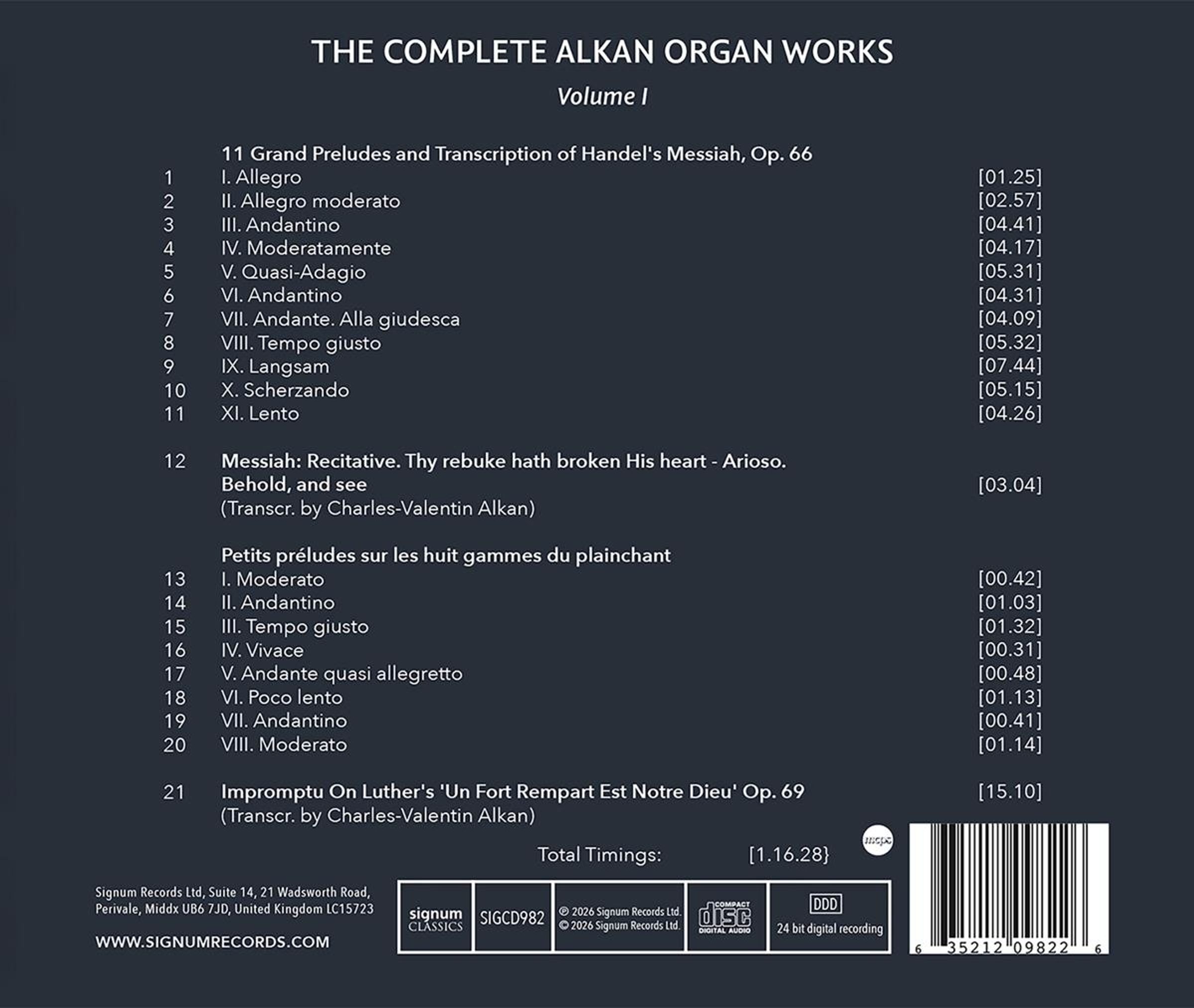 11 Große Präludien & Transkriptionen aus Händels Messias op. 66; Transkription des Rezitativs "Thy Rebuke has broken his Heart" aus Händels Messias; Petits Preludes sur les huit gammes de plainchant; Impromptu op. 69 über Luthers "Ein feste Burg ist unser Gott"