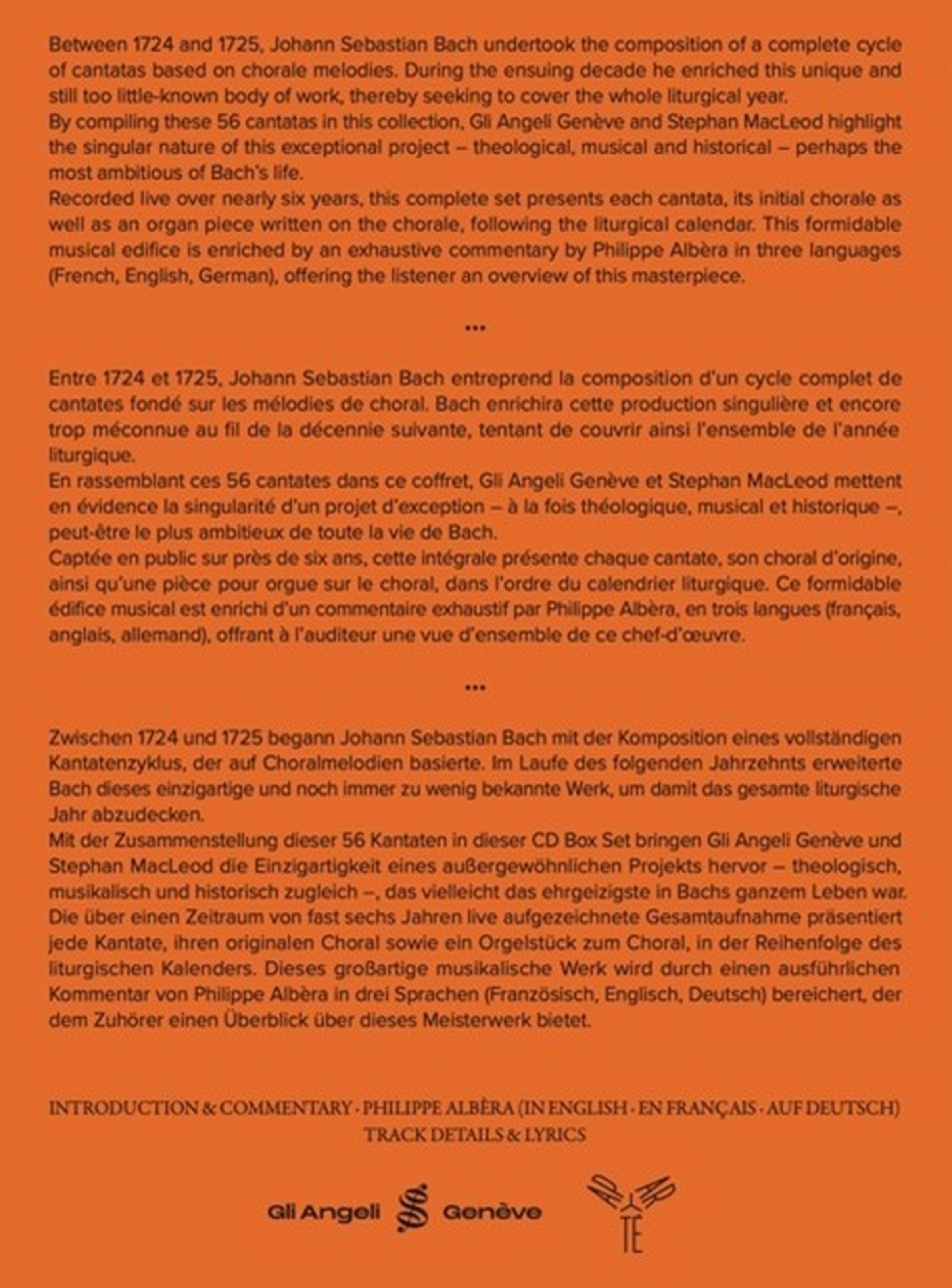 Zwischen 1724 und 1725 begann Johann Sebastian Bach mit der Komposition eines vollständigen Kantatenzyklus, der auf Choralmelodien basiert. In den folgenden zehn Jahren erweiterte Bach dieses einzigartige und bis heute weitgehend unbekannte Werk und versuchte, das gesamte Kirchenjahr abzudecken. Mit der Zusammenstellung dieser 56 Kantaten in dieser Sammlung unterstreichen Gli Angeli Genève und Stephan MacLeod die Einzigartigkeit dieses außergewöhnlichen Projekts – theologisch, musikalisch und historisch zugleich –, das vielleicht ambitionierteste in Bachs Leben. Die über fast sechs Jahre live aufgenommene Gesamtausgabe präsentiert jede Kantate, ihren Originalchoral und ein darauf basierendes Orgelstück in der Reihenfolge des Kirchenjahres. Ein gewaltiges musikalisches Bauwerk, ergänzt durch einen umfassenden Kommentar in drei Sprachen (Französisch, Englisch, Deutsch), der dem Hörer einen Überblick über dieses Meisterwerk bietet.