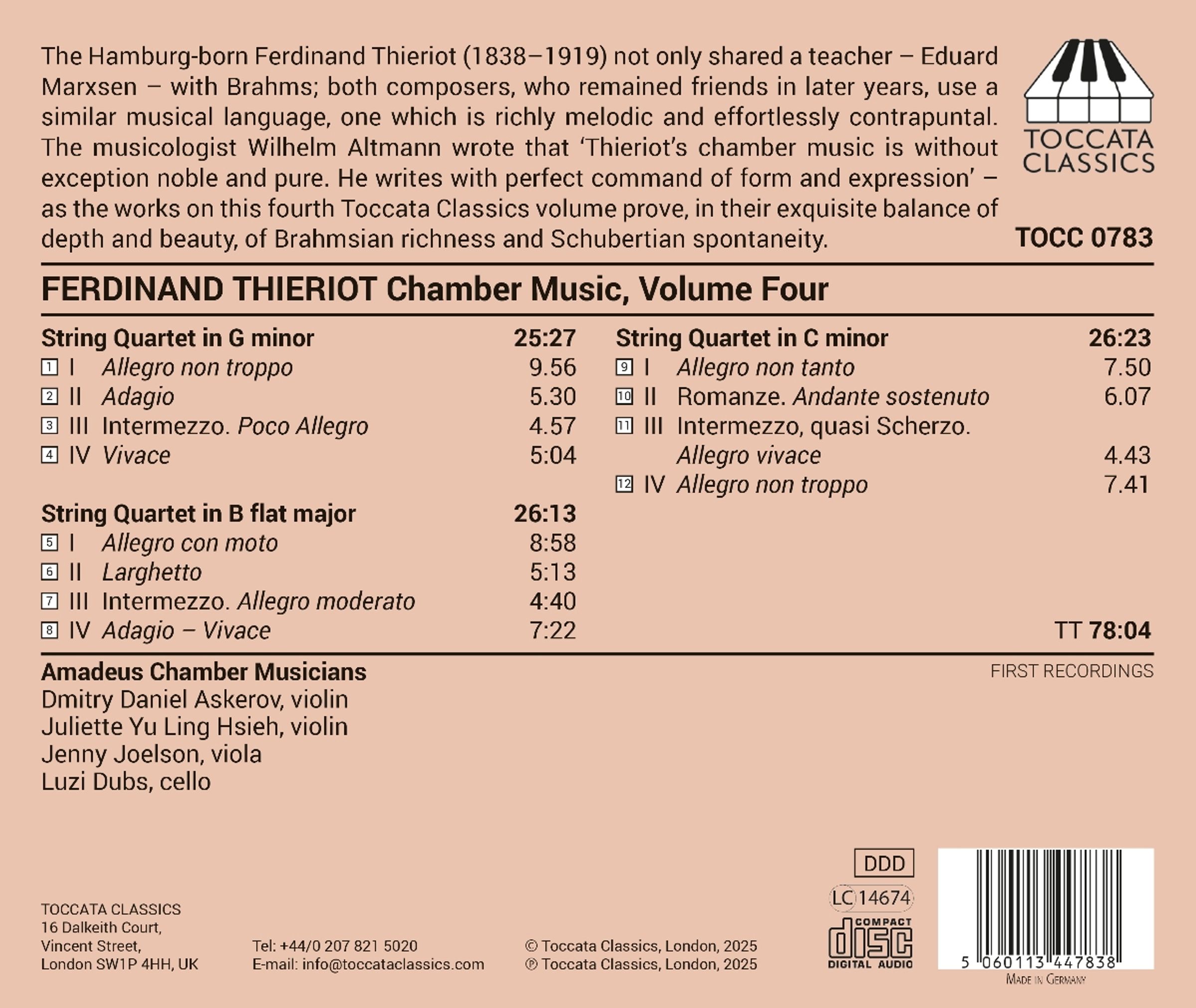 Der in Hamburg geborene Ferdinand Thieriot (1838-1919) hatte nicht nur denselben Lehrer wie Brahms - nämlich Eduard Marxsen -, sondern beide Komponisten, die auch in späteren Jahren befreundet blieben, verwendeten eine ähnliche musikalische Sprache, die reich an Melodien und mühelos kontrapunktisch ist. Der Musikwissenschaftler Wilhelm Altmann schrieb: "Thieriots Kammermusik ist ausnahmslos edel und rein. Er komponiert mit perfekter Beherrschung von Form und Ausdruck" - wie die Werke auf diesem vierten Album mit Erstaufnahmen seiner Werke beweisen, die sich durch eine exquisite Balance aus Tiefe und Schönheit, Brahms'scher Fülle und Schubertscher Spontaneität auszeichnen.
