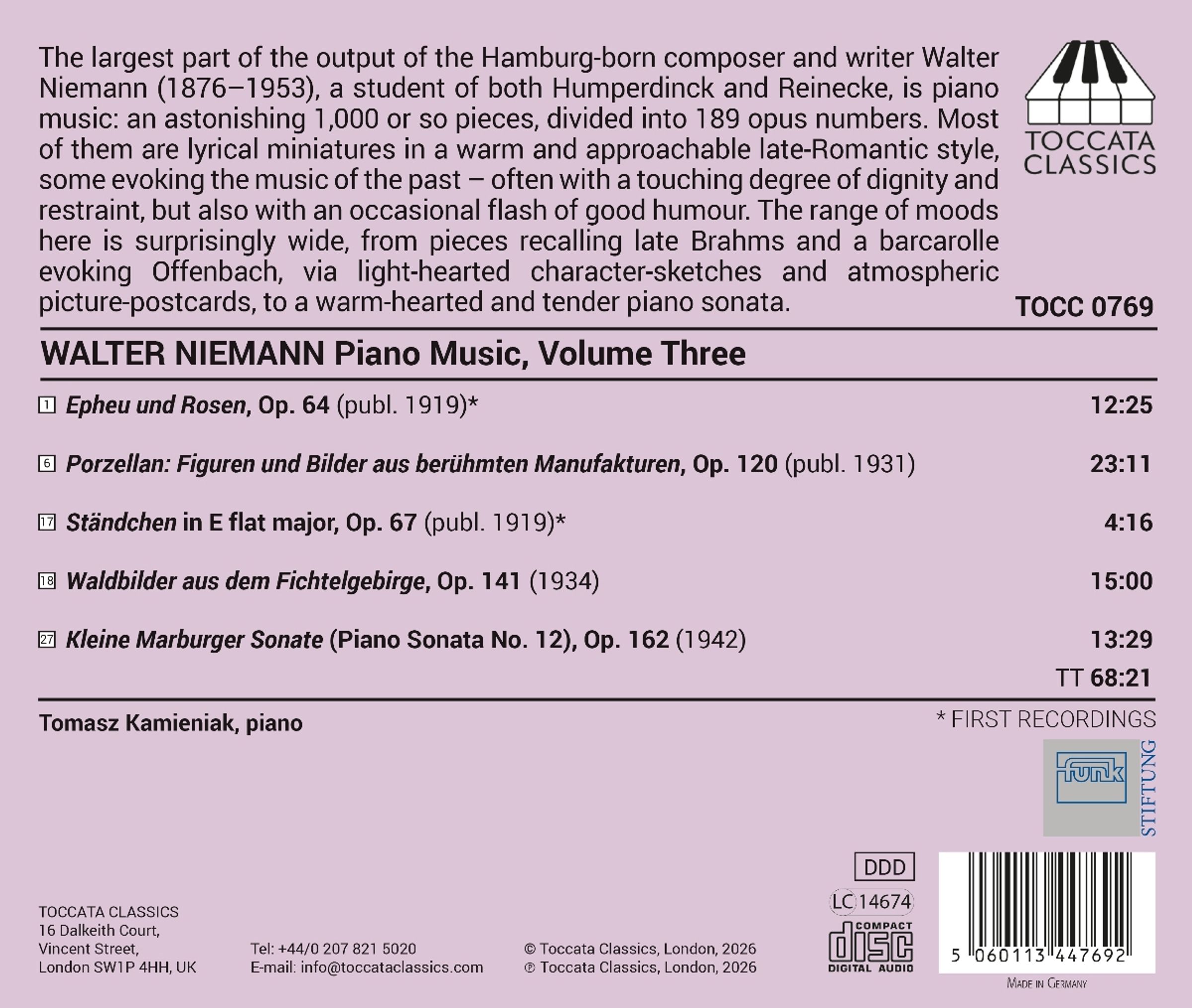 Der größte Teil des Schaffens des in Hamburg geborenen Komponisten und Schriftstellers Walter Niemann (1876-1953), einem Schüler von Engelbert Humperdinck und Carl Reinecke, besteht aus Klaviermusik: erstaunliche rund 1.000 Stücke, unterteilt in 189 Opusnummern. Die meisten davon sind lyrische Miniaturen in einem warmen und zugänglichen spätromantischen Stil, von denen einige an die Musik der Vergangenheit erinnern - oft mit einer berührenden Würde und Zurückhaltung, aber auch mit gelegentlichen Anflügen von Humor. Die Bandbreite der Stimmungen ist hier überraschend groß, von Stücken, die an den späten Johannes Brahms erinnern, und einer Barcarole, die an Jacques Offenbach erinnert, über heitere Charakterskizzen und stimmungsvolle Postkarten bis hin zu einer warmherzigen und zarten Klaviersonate. Tomasz Kamieniak ist der Pianist dieser Aufnahme. Er studierte an der Musikakademie Katowice und der Hochschule für Musik Franz Liszt Weimar. Dort erhielt er auch den Spezialpreis beim 4. Internationalen Franz-Liszt-Wettbewerb und durfte Werke von Józef Wieniawski aufnehmen. Er tritt international auf und ist auch als Komponist erfolgreich.
