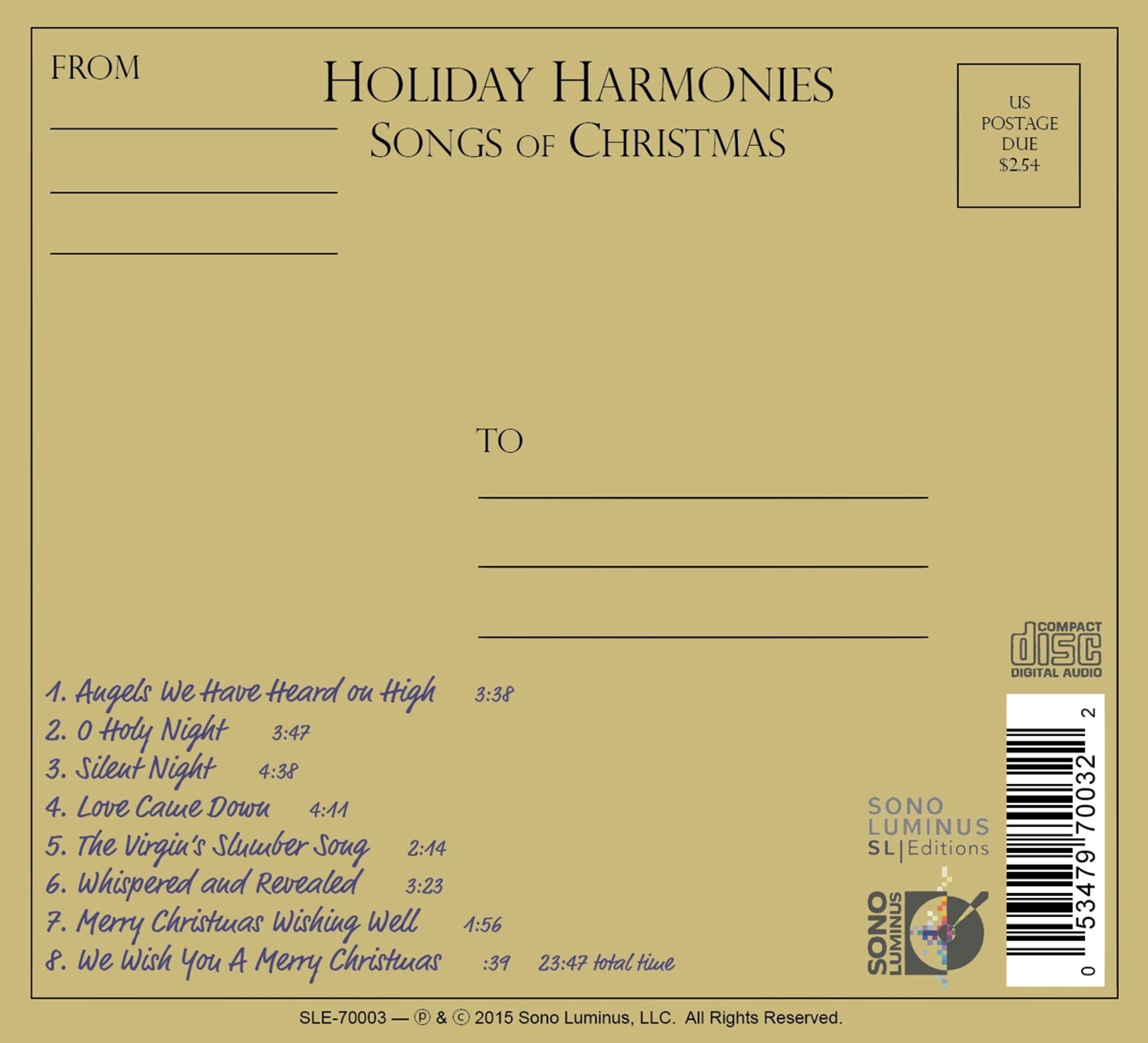 Judith Clurman dirigiert ihren gefeierten Chor, Essential Voices USA, in Holiday Harmonies: Sounds of Christmas, der dritten Aufnahme des Ensembles für Sono Luminus. Diese Weihnachts-CD enthält Erstaufnahmen neuer, lebendiger Arrangements von Weihnachtslieblingen und neue Werke, die von einigen der besten Komponisten Amerikas für diese CD geschrieben wurden. Die Mezzosopranistin Jamie Barton, die Sopranistin Maureen McKay, der Pianist Tedd Firth und die Harfenistin Stacey Shames sind die Hauptakteure. Das traditionelle Repertoire umfasst: "Angels We Have Heard on High" (arr. David Chase), "O Holy Night" (arr. Ryan Nowlin), "Silent Night" (arr. Tedd Firth und Judith Clurman), "The Virgin's Slumber Song" (Max Reger) und "We Wish You a Merry Christmas" (Bearbeitung Judith Clurman). Zu den neuen Werken gehören: "Whispered and Revealed" (Nico Muhly), "Love Came Down" (Jennifer Higdon) und "Merry Christmas Wishing Well" (Gene Gilroy, arr. Michael Gilbertson). Übersetzt mit www. DeepL. com / Translator (kostenlose Version)