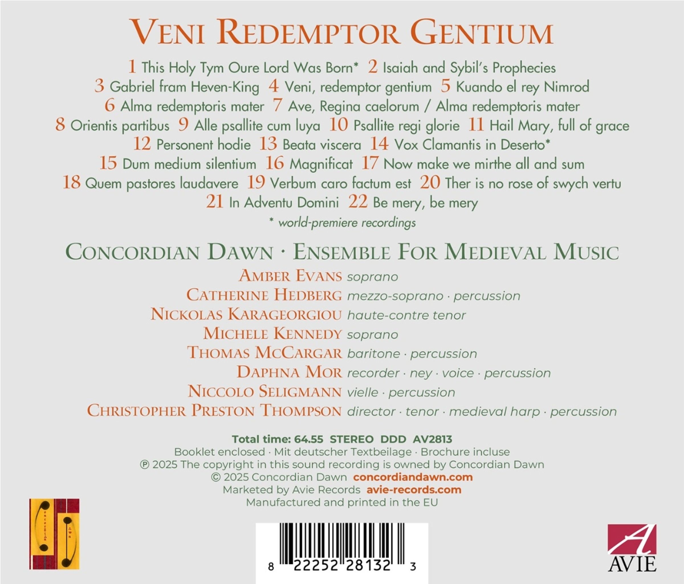 Das 2012 in New York gegründete Ensemble für Alte Musik Concordian Dawn präsentiert mit „Veni Redemptor Gentium“ eine musikalische Feier der Weihnachtszeit mit Werken aus der Zeit vom 13. bis 15. Jahrhundert. Neben dem mittelalterlichen Repertoire erklingen einige Traditionals sowie zwei Ersteinspielungen des australischen Komponisten David Yardley, dessen Musik wiederum vom Mittelalter inspiriert ist.