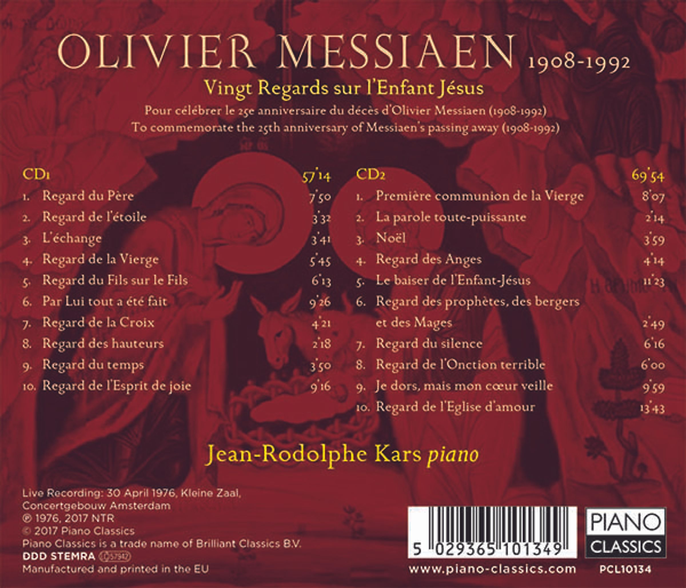Außer Olivier Messiaens zweiter Ehefrau Yvonne Loriod gibt es vermutlich keinen anderen Interpreten, der die Musik des französischen Komponisten besser und intimer kannte als der austro-französische Pianist Jean-Rodolphe Kars. Bereits als Jugendlicher spezialisierte er sich auf Messiaen und setzte sich ausgiebig nicht nur mit dessen musikalischen Werken, sondern in zunehmendem Maße auch mit seinen geistlichen Abhandlungen auseinander. Die tiefe Religiosität der Musik bezeichnet Kars rückblickend als entscheidend für seine Hinwendung zum Katholizismus und für seine Berufung als Priester, Messiaen sei sein »erster geistiger Vater«. Die vorliegende Aufnahme Jean-Rodolphe Kars’ der »Vingt Regards sur l’Enfant Jésus« Messiaens blieb bisher unveröffentlicht und belegt die intensive Spiritualität, die Komponist und Interpret miteinander verbindet.