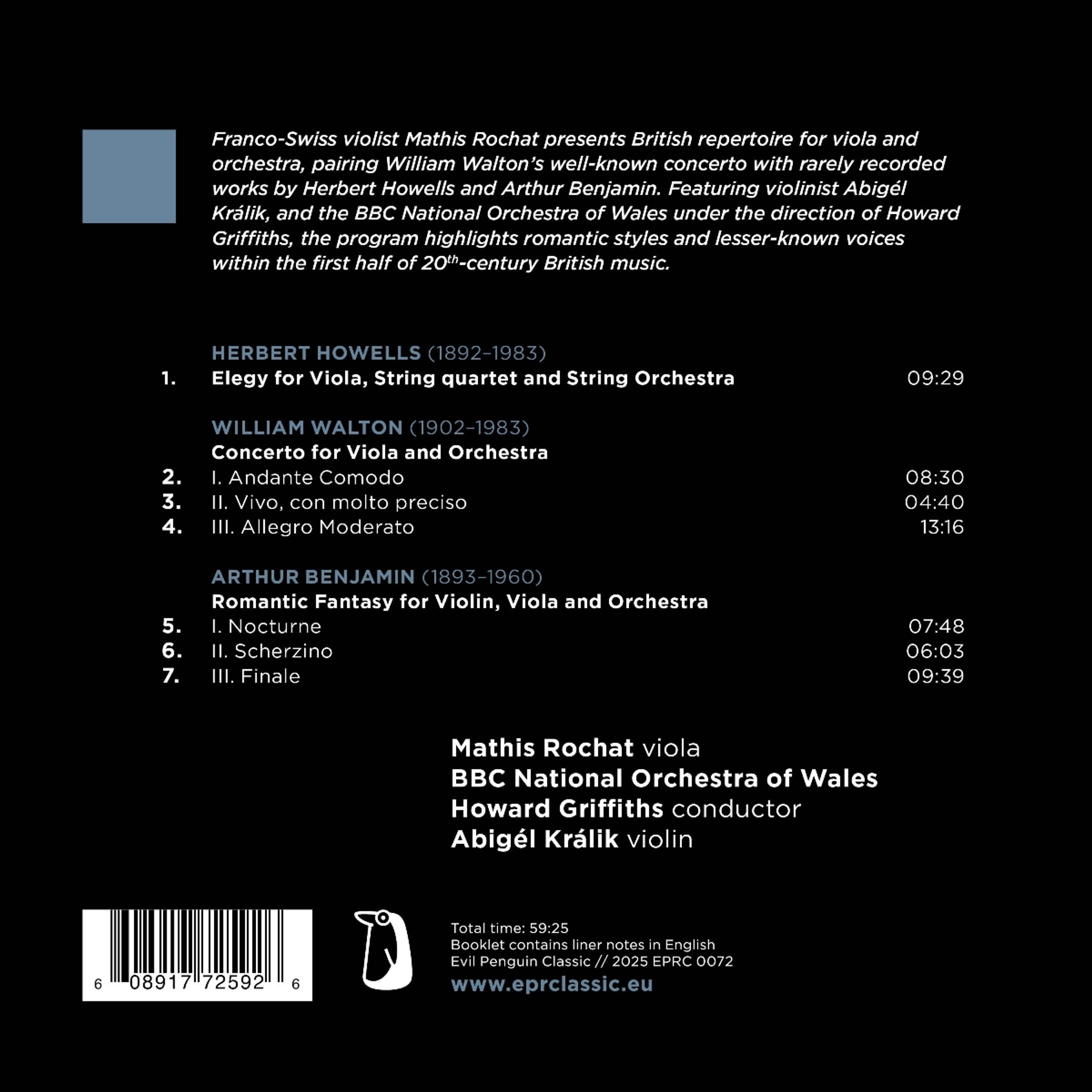 Der französisch-schweizerische Bratschist Mathis Rochat präsentiert britisches Repertoire für Viola und Orchester und stellt William Waltons bekanntes Konzert neben selten aufgenommene Stücke von Herbert Howells und Arthur Benjamin. Mit der ungarisch-nicaraguanisch-amerikanischen Geigerin Abigél Králik und dem BBC National Orchestra of Wales unter der Leitung von Howard Griffiths beleuchtet das Programm Stilrichtungen und weniger bekannte Vertreter der britischen Musik der ersten Hälfte des 20. Jahrhunderts.
