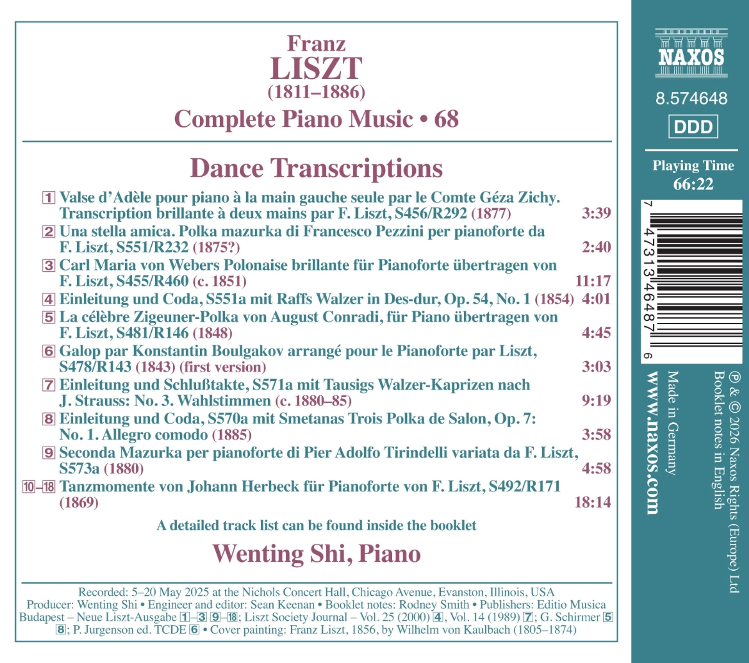 Lists Freundeskreis und sein musikalischer Bekanntenkreis waren sowohl weitreichend als auch vielfältig. In seiner typisch großzügigen Art förderte er deren Musik oft durch Transkriptionen, Bearbeitungen und Ergänzungen. Diese Sammlung enthält unter anderem Bearbeitungen von Tanzmusik berühmter Zeitgenossen wie Weber und Smetana, Ergänzungen zu einem Werk von Liszts Weimarer Assistenten Joachim Raff sowie eine funkelnde Solotranskription der „Tanzmomente“ des einflussreichen Wiener Komponisten und Dirigenten Johann von Herbeck.