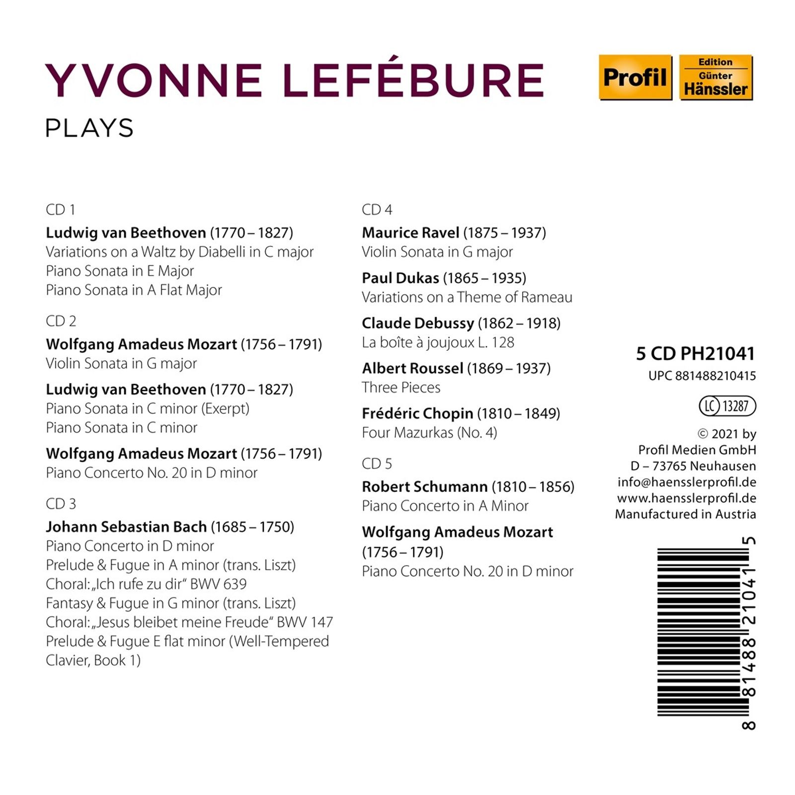 Yvonne Lefebure plays Beethoven/Mozart/Bach/Ravel/Chopin auf 5 CDs