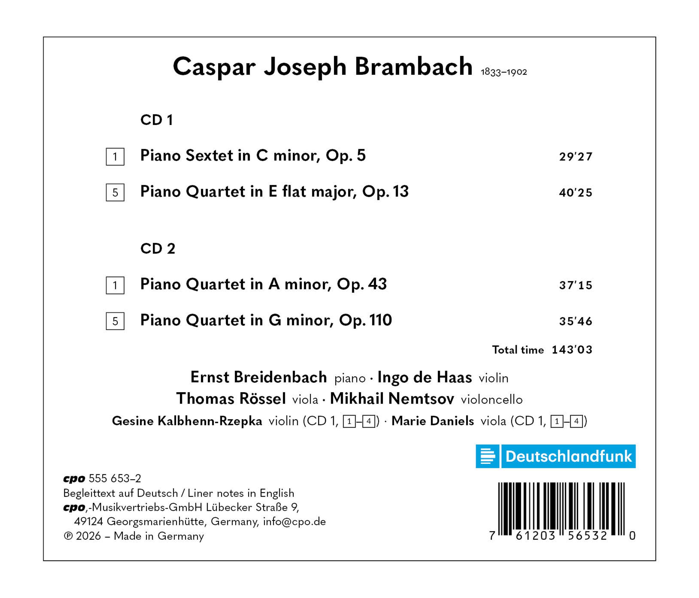 Zwei Monate jünger als Johannes Brahms, den er um rund fünf Jahre überlebte, konnte sich Caspar Joseph Brambach einst durchaus im Bewusstsein einer ansehnlichen Beachtung sonnen. Er hatte am Kölner Konservatorium studiert und unterrichtet und war acht Jahre als Musikdirektor in Bonn tätig gewesen, bevor er sich vornehmlich dem eigenen Schaffen widmete, in dem die Vokalmusik den größten Raum einnahm. Besonderen Anklang fanden seine Männerchöre, doch auch die instrumentalen Werke waren beliebt, denn der Rheinländer Brambach ließ keinen Zweifel daran, dass die Meister der Romantik, allen voran Robert Schumann, in seinem Empfinden eine wesentliche Rolle spielten. Die vorliegende Erstaufnahme enthält neben dem Sextett für Klavier und Streicher aus der letzten Kölner und frühen Bonner Zeit (um 1860) die drei Klavierquartette, mit deren letztem der Komponist sich noch kurz vor der Jahrhundertwende zu seinen Idealen bekannt hat.