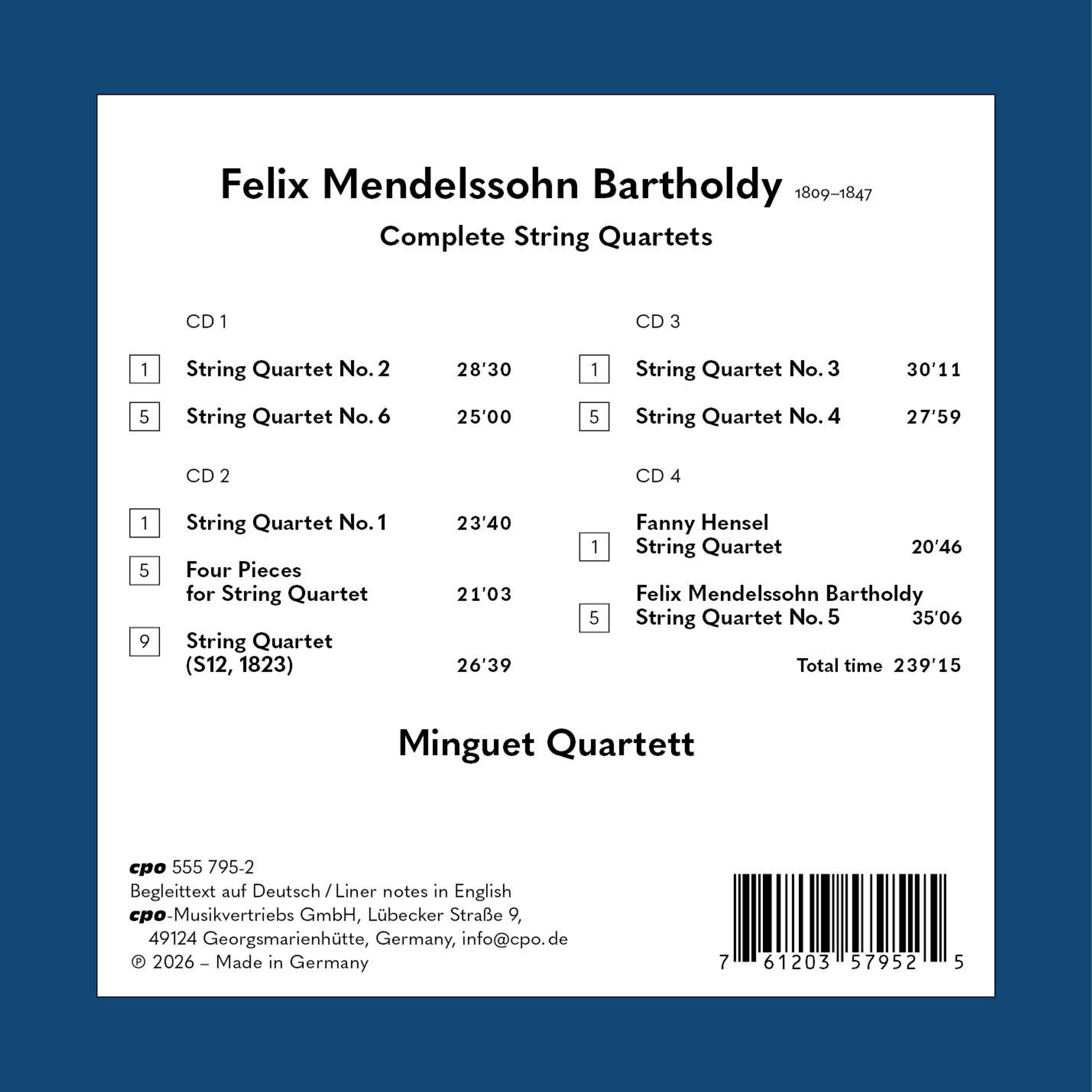 Mendelssohn komponierte in allen damals geläufigen Gattungen, von der Klaviermusik bis zur Oper. Und auch die Kammermusik nahm mit 30 Werken einen wichtigen Platz ein: Neben vier Klavierquartetten, je zwei Sonaten für Violine und Klavier sowie Cello und Klavier, zwei Streichquintetten, einem Klaviersextett und einem Oktett schrieb er sieben Streichquartette, die nun komplett in der packenden Interpretation des Minguet Quartetts in diesem Set vorliegen.