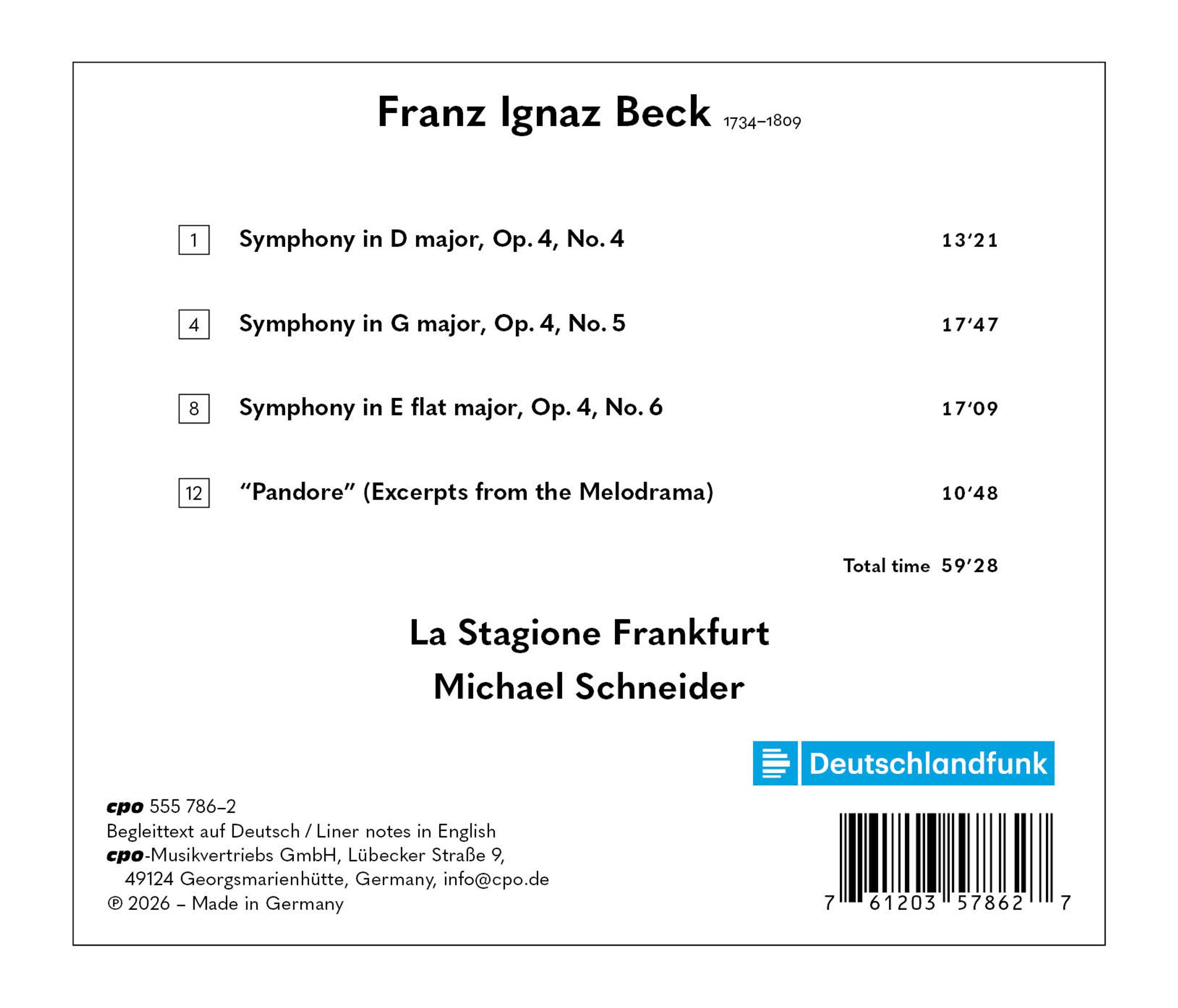 Franz Ignaz Beck war ein »Mannheimer Schüler« von Anfang an. Der Sohn des Hofoboisten Franz Aloys Beck wurde nach dessen frühem Tod von anderen Hofmusikern unterrichtet, bevor er in Venedig bei Baldassare Galuppi studierte und endlich über Neapel nach Frankreich kam. Er ist 23, als in Paris drei seiner Sinfonien Beifall finden; doch ihn zieht’s weiter – nach Marseille und nach Bordeaux, wo er bis 1798 (über 35 Jahre) als Maître de Musique sowohl für Opern und Konzerte als auch für die Aufführung eigener und fremder Werke verantwortlich ist. Aus den frühen Jahren an der Garonne stammen die sechs Sinfonien op. 4, die jetzt vollständig vorliegen: Es sind die letzten Beiträge Becks zu der Gattung, mit der er riskante, gleichwohl erfolgreiche Experimente unternahm– stürmend und drängend, erfüllt von überraschenden Wendungen, die das Publikum enthusiasmierten und erklären, warum man den Komponisten mitunter als »Berlioz des 18. Jahrhunderts« apostrophierte. Die 20 Jahre jüngere Musik aus dem Melodram Pandore bildet dazu einen aufschlussreichen Kontrapunkt …