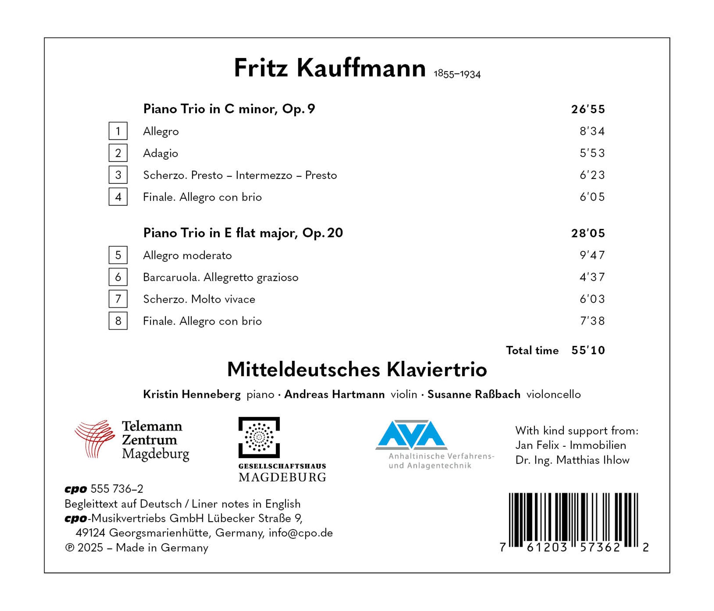 In Fritz Kauffmann sehen wir einen jener Komponisten, die ihre naturgegebene Kreativität nie zur Gänze auslebten, weil sie unter einer ausgeprägten Mehrfachbegabung »litten«. Das Resultat stellt sich im konkreten Fall so dar, dass der Sohn eines Berliner Kommerzienrats nach dem Studium und einiger Zeit als Privatlehrer seit 1889 für die Reform des Magdeburger Musiklebens sorgte, ebendort als Dirigent und Pianist wirkte und darüber sein eigenes Schaffen zu kurz kommen ließ. Dem Bedauern, das einige Zeitgenossen darüber äußerten, wird man sich gern angesichts der beiden hier vorliegenden Klaviertrios aus den 1880er Jahren anschließen. Hier spricht ein kraftvoller Romantiker, der im Rahmen vertrauter Formen eine subtile Originalität auslebt: von der dramatischen Pranke bis zum feinen Humor reichen seine Ausdrucks- und Gestaltungsmöglichkeiten, die auch – man höre die »Barcaruola« des Opus 20 – den Ohrwurm nicht verbieten.