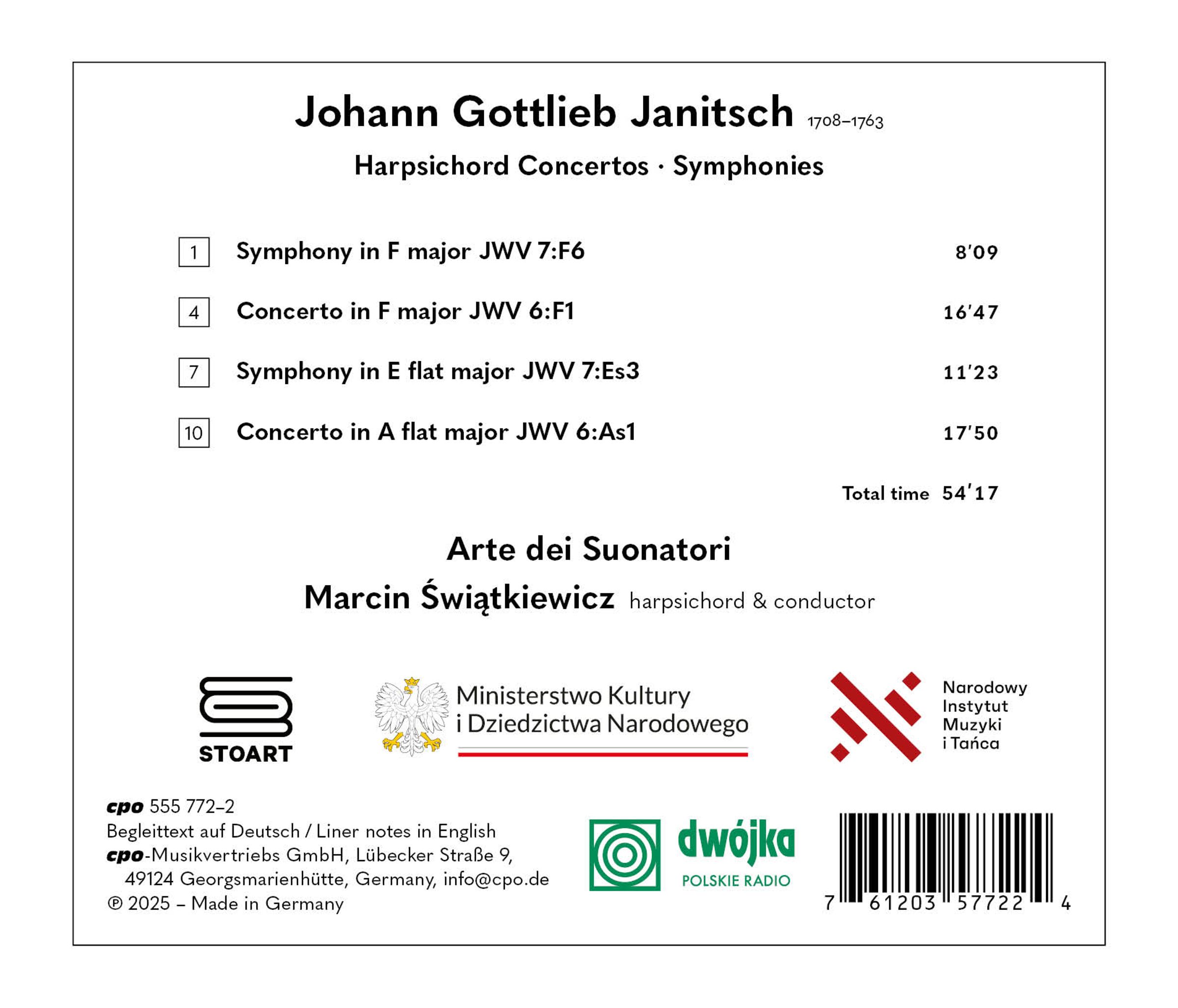 In dem schlesischen Städtchen Schweidnitz (Świdnica) entstand kurz nach dem Ende des Dreißigjährigen Krieges die protestantische Friedenskirche, die von Marcin Swiatkiewicz und der Arte dei Suonatori aus nächstliegendem Grunde zum Aufnahmeort der vorliegenden Produktion erkoren wurde: Johann Gottlieb Janitsch, der Komponist der vier Werke, erblickte das Licht der Stadt, als der großartige Fachwerkbau ein halbes Jahrhundert alt war, und er dürfte – so Swiatkiewicz – durch den genius loci mancherlei Eindrücke empfangen haben, die ihn auf seinem weiteren Weg begleiteten. Dieser führte nach dem ersten Unterricht vor Ort zum Jurastudium nach Frankfurt an der Oder, in die Dienste des damaligen preußischen Kriegsministers und an den Hof des Kronprinzen Friedrich nach Rheinsberg, der ihm gestattete, mit seiner eigenen Kapelle regelmäßige Konzerte für bürgerliche Hörerkreise zu veranstalten – ein bahnbrechender Schritt, an dessen Erfolg der galant-empfindsame Stil der Musik, wie hier zu hören, gewiss keinen unerheblichen Anteil hatte.