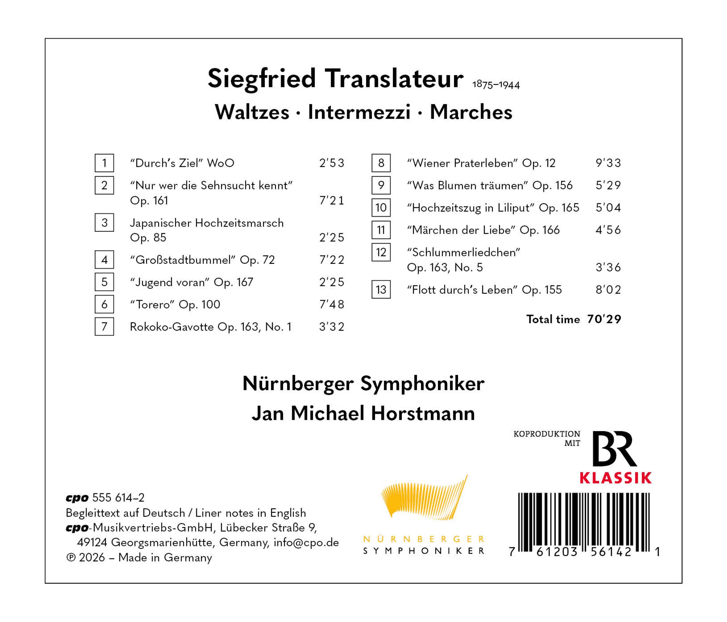 »Wer kennt nicht diesen liebenswürdigen Meister der leichten Muse?« fragte 1925 ein Lobredner, als der Berliner Komponist und Verleger Siegfried Translateur seinen 50. Geburtstag feierte. Während diese rhetorische Frage heute, nach der 150. Wiederkehr seines Wiegenfestes, keine nennenswerten Reaktionen mehr auslösen dürfte, wird der Saal einst begeistert applaudiert haben: Schließlich war der gebürtige Oberschlesier mit seinen Kreationen insgesamt gut im Geschäft, ganz zu schweigen davon, dass das Wiener Praterleben aus der Studienzeit jüngst zur Hymne des Berliner Sechstagerennens und somit zum »Sportpalastwalzer« mutiert war: Wenn Reinhold Franz Habisch alias »Krücke« pfiff, kochte der »Nudeltopp«. Doch Translateur ist mehr. Er weiß, was Blumen träumen, bummelt gemächlich durch die Großstadt, walzt schwungvoll durchs Leben – ein charmanter Repräsentant der silbernen Ära, die eben doch nicht untergegangen ist.