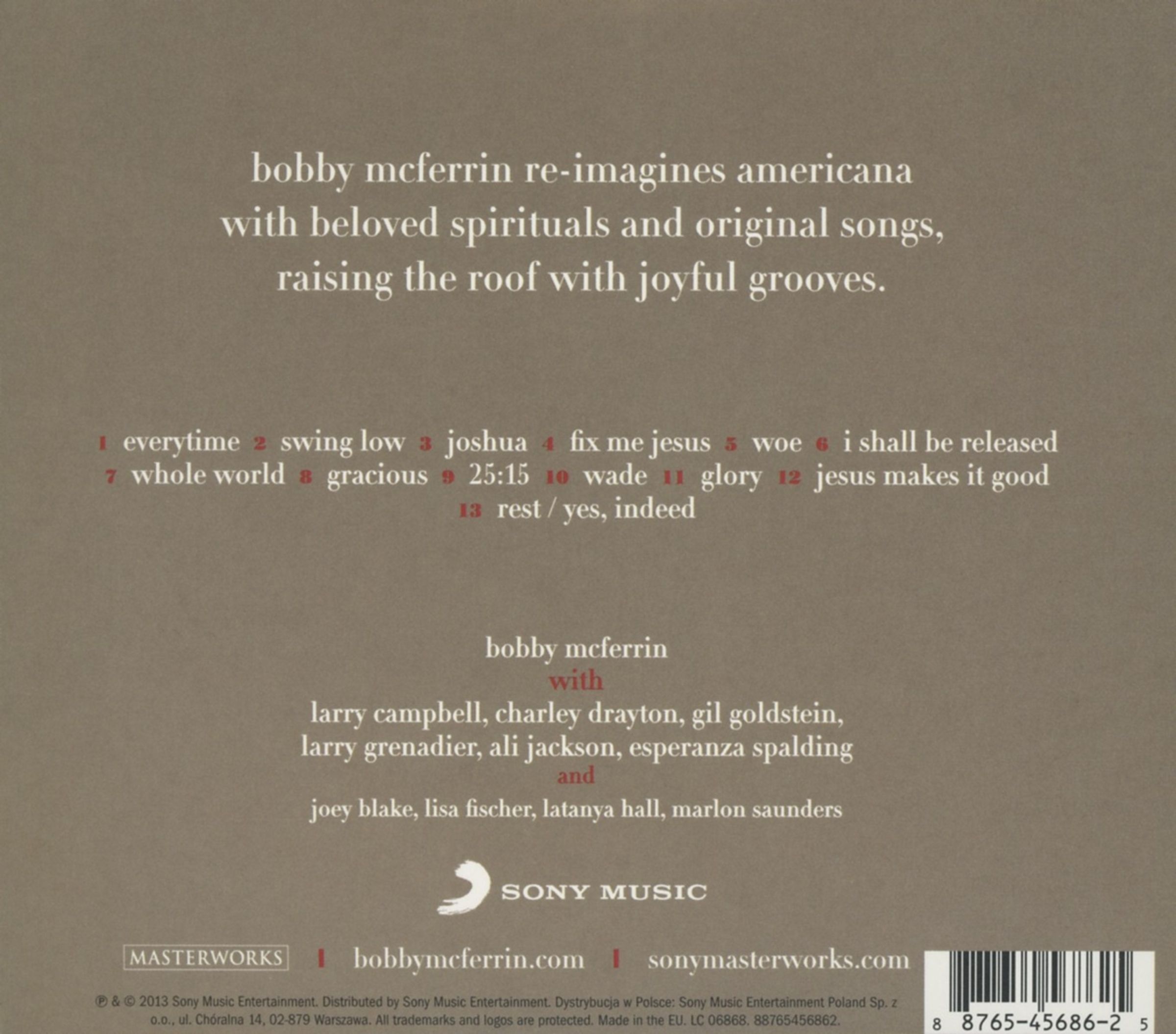 Mit einer musikalischen Mischung aus Jazz, Fusion, Bluegrass, Weltmusik und Blues spürt Bobby McFerrin der spirituellen Tiefe und Lebensfreude dieser Songs nach. Dabei zieht er alle Register seiner vokalen und improvisatorischen Bandbreite, für die er legendär ist. In „Fix Me Jesus" imitiert er atemberaubend den Klang einer Mundharmonika. In „Woe" und „Swing Low" lässt er seine Stimmbänder magisch klingen. Und während aus „Joshua" ein groovebetonter Spiritual wird, singt McFerrin in gleich zwei Traditionals („Everytime (I Feel the Spirit)", „Whole World (In His Hands)") im Duett mit der amerikanischen Sängerin und Star-Bassistin Esperanza Spalding.