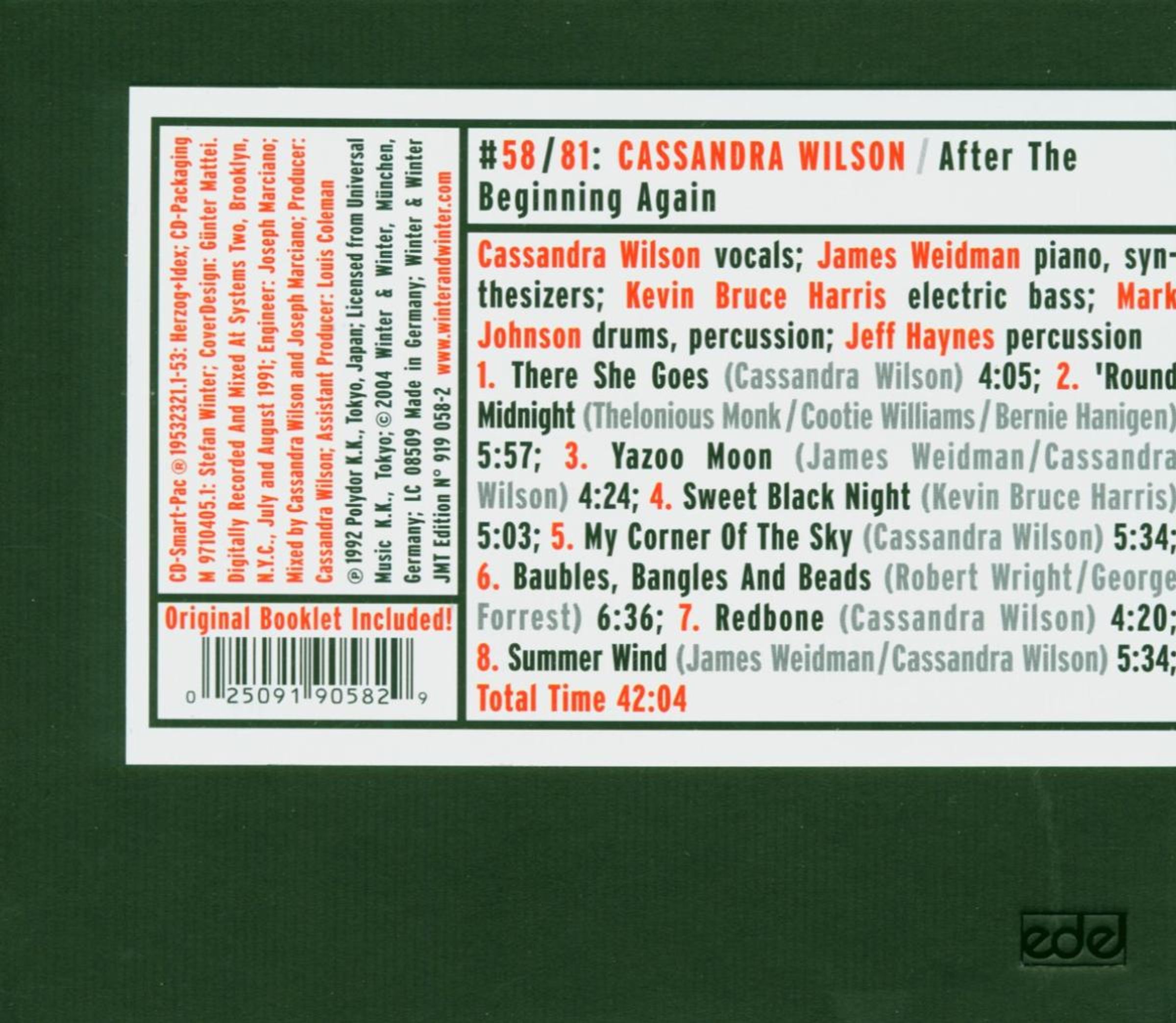 Cassandra's seventh album on JMT is kind of retrospective. Her debut in 1985, Point of View (JMT 919 004-2) , was one of the formative albums of what was to become the M-Base movement. The next milestone was Blue Skies (919 018-2), Cassandra's highly acclaimed acoustic standard album. Jumpworld (JMT 919 033-2) marked the beginning of her flirt with hip hop. Traces of all of them can be found on After the Beginning again, Cassandra's last album for JMT after seven years of successful cooperation.