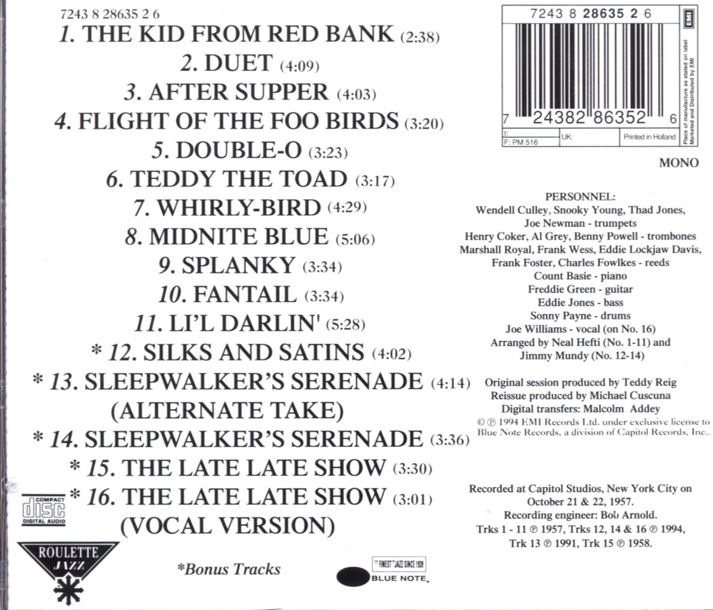 On October 21 and 22, 1957, Basie’s band, sounding better than ever, went into the studio to cut 11 new volcanic Neal Hefti charts. Every tune became a classic, changing the course of this great band and this gifted composer-arranger. Five additional tracks from those sessions, arranged by Jimmy Mundy, are added to this great sounding CD.