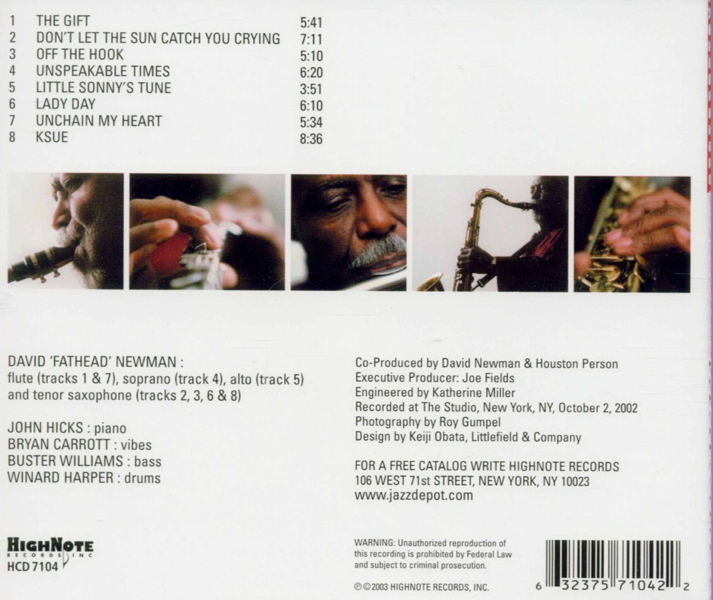 The definitive soul-jazz, blues and funk player, David 'Fathead' Newman also has the capacity to burn in a bebop mode and wax poetic over a romantic ballad with the best of them. David accomplishes all of the above on his new record, "The Gift." A native of Dallas, David came to national prominence in the '50s while working with Ray Charles. He has been a reliably swinging force on the scene and a imaginative, well-respected leader for the past four decades. With keyboard giant, John Hicks, laying down the changes, Winard Harper propelling the rhythm along and Bryan Carrott adding just the right amount of exotic color, David offers up eight tunes with not only his trade-mark Texas-Tenor sound, but also displays his considerable prowess on alto, soprano and flute.