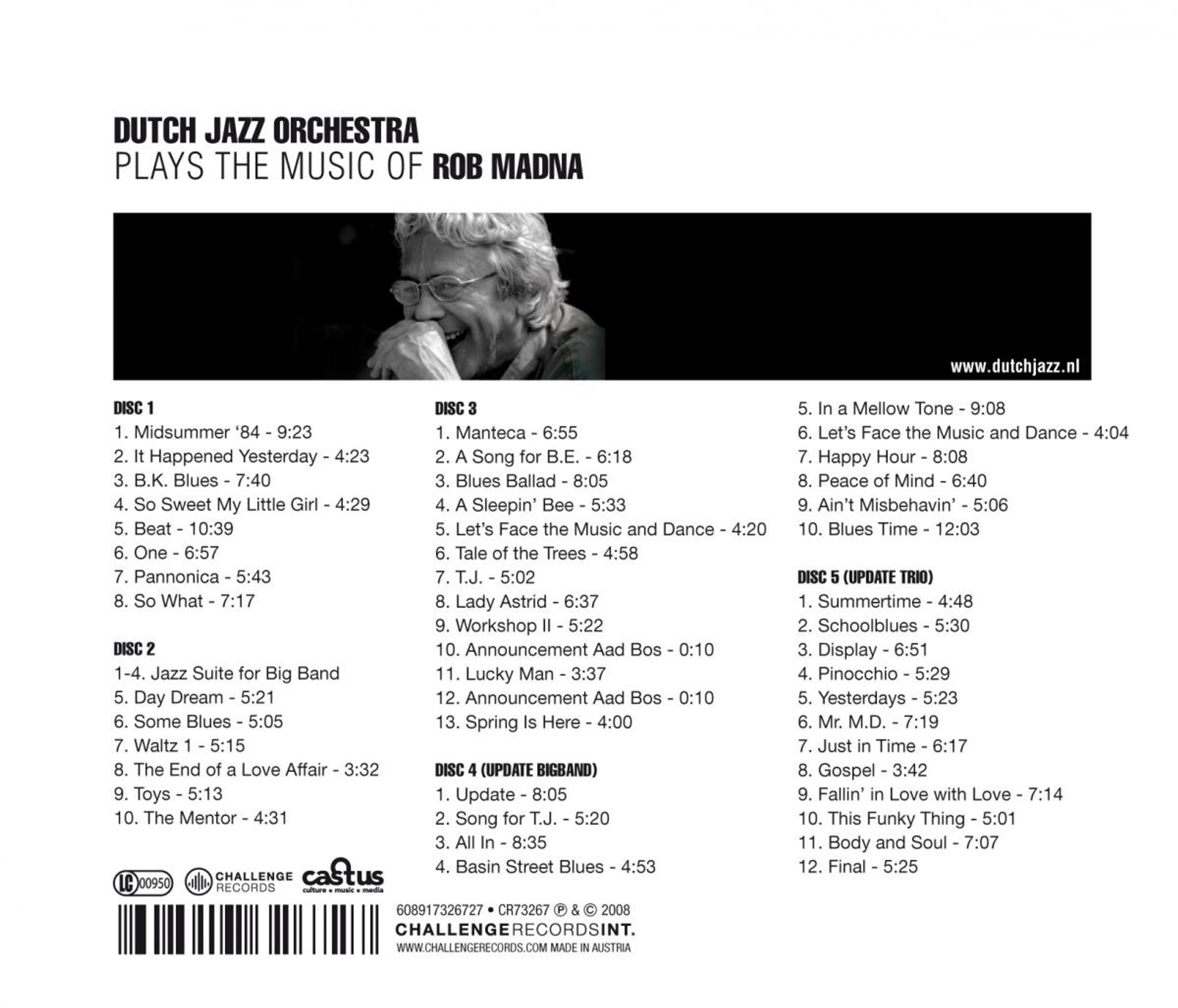Eine 5-CD Box als Verbeugung vor Rob Madna (1931-2003), der gleichsam als Begründer des modernen Jazz in Holland gilt. Standards, von Madna arrangiert, aber auch Originale Madna´s werden auf 3 CDs von der bekannten Big Band interpretiert, CD 4 ist ein Re-release einer DJO-Aufnahme mit Madna an Piano und Trompete, CD 5 eine Trio-Aufnahme, ebenfalls ein Re-release einer vergriffenen CD.