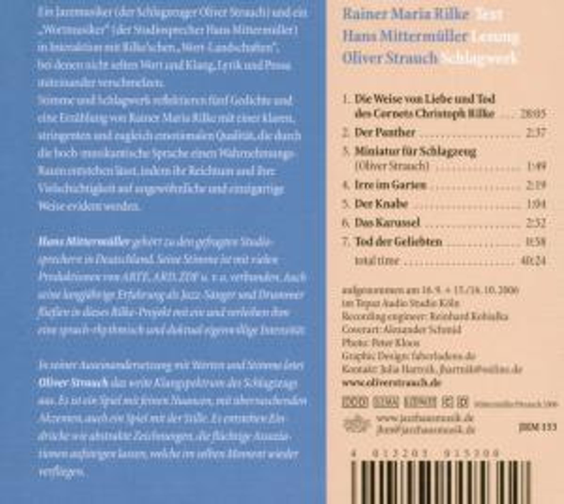 Der Saarbrücker Schlagzeuger und Perkussionist Oliver Strauch und Hans Mittermüller, einer der wirkungsvollsten Sprecher der Republik (ARTE, ARD, ZDF), vertonen Rainer Maria Rilkes "Cornet". Gemeinsam präsentieren die beiden dieses hochmusikalische Stück Prosa, die tragische Geschichte des jungen Fahnenträgers im ersten Österreichischen Türkenkrieg (1663-64) uvm."