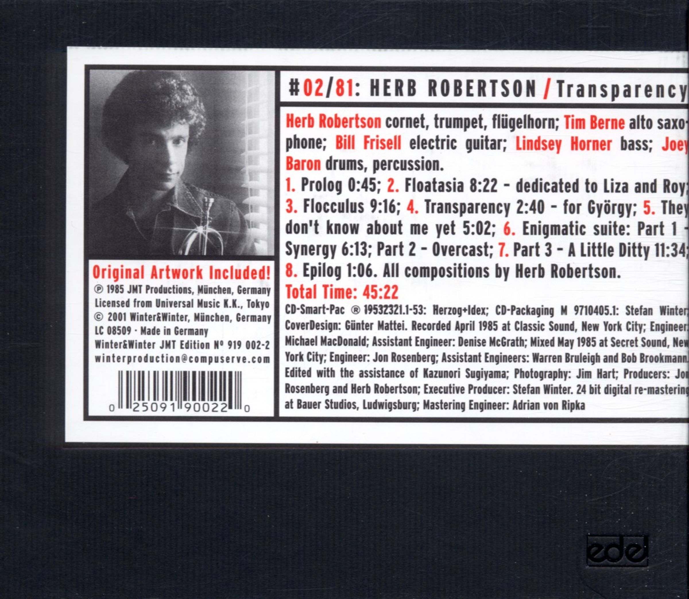 Herb Robertson presents his first leader album on JMT, too. Those who have listened to the album Split Image of Mark Helias with Dewey Redman knews that Herb Robertson is a great musician. According to well known critic Nat Hentoff, he has "a singing horn, a chuckling horn, a searing horn, and mischievous horn, and brings a mercurial wit to the music that's been missing since Vic Dickenson."