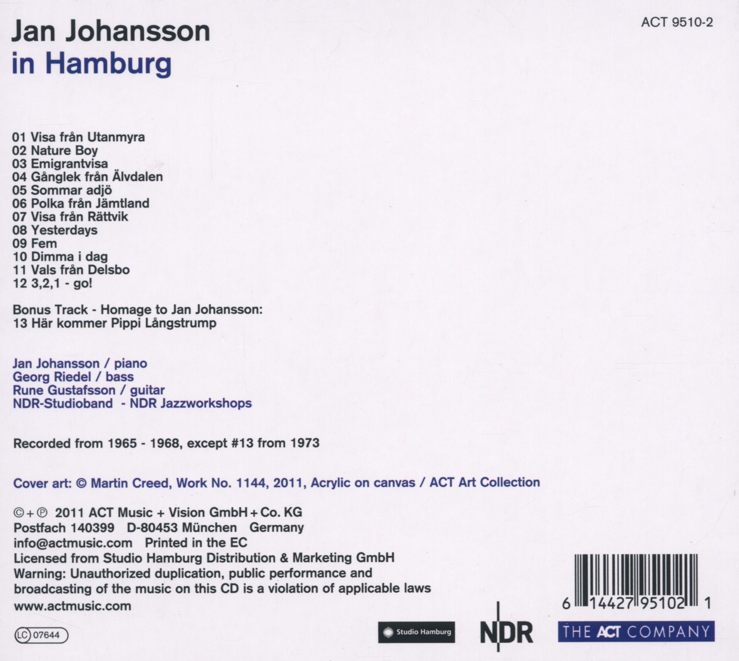 Ohne Zweifel würde Jan Johansson heute zu den international berühmten europäischen Jazzstars gehören, auf einer Stufe mit Namen wie Albert Mangelsdorff, wäre er nicht tragischerweise 1968, erst 37 Jahre alt, bei einem Unfall ums Leben gekommen. Dass er am 9. November 2011 seinen 80. Geburtstag gefeiert hätte, ruft nun ACT, das wichtigste Label für schwedische Jazzmusik, mit dem Album „Jan Johansson in Hamburg with Georg Riedel“ (ACT 9510-2) in Erinnerung. Herausragende Einspielungen für den NDR aus den Jahren 1964 bis 1966 sind darauf versammelt, unter anderem solche, die bei den legendären NDR-Workshops entstanden sind. Johansson spielte hier mit „New Faces from Sweden“ wie dem Holzbläser Arne Domnerus, dem Flötisten Claes Rosendahl oder dem Gitarristen Rune Gustafsson und auch mit der NDR-Studioband – immer aber mit dem Bassisten Georg Riedel.