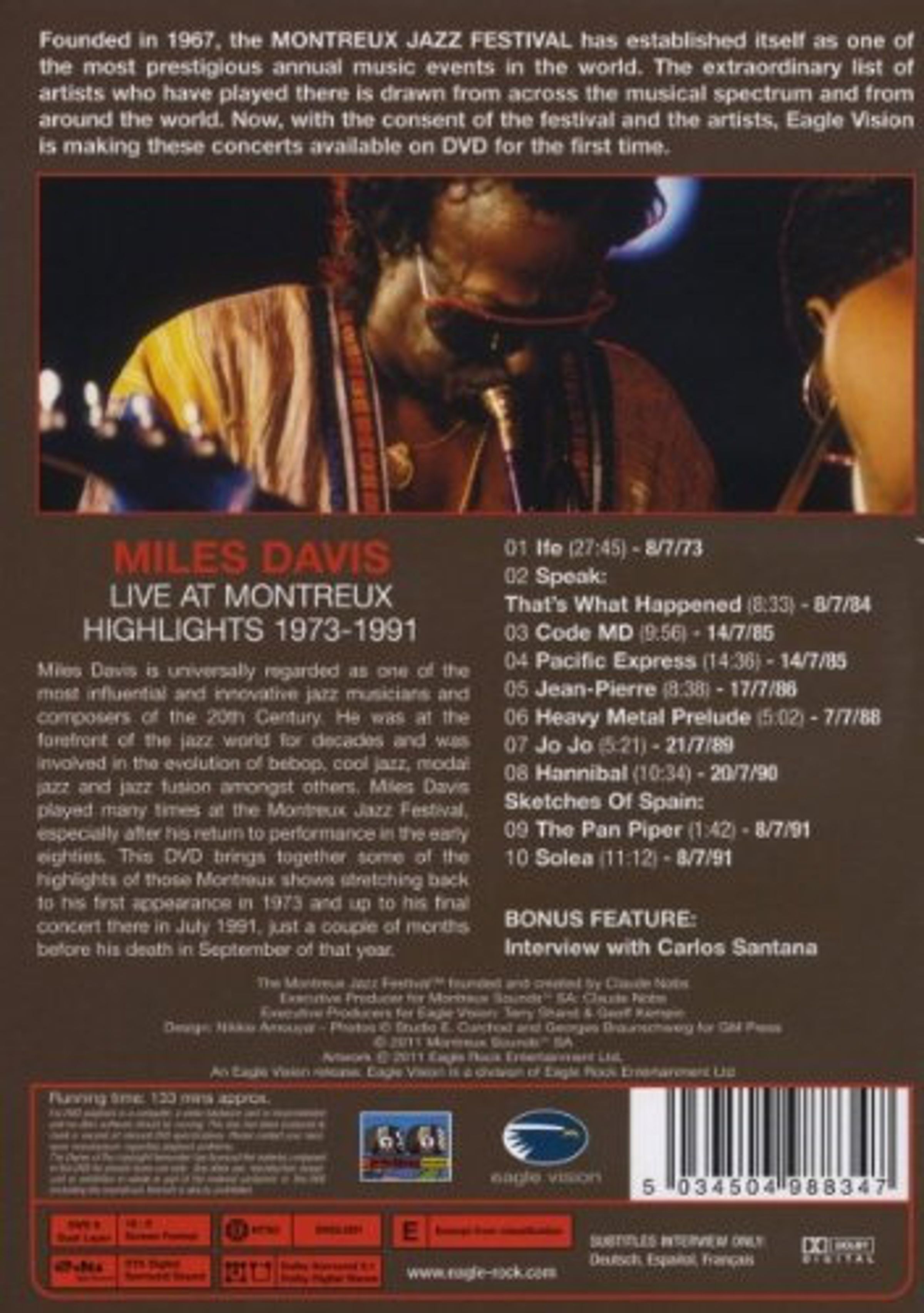 Miles Davis is universally regarded as one of the most influential and innovative jazz musicians and composers of the 20th Century. He was at the forefront of the jazz world for decades and was involved in the evolution of bebop, cool jazz, modal jazz and jazz fusion amongst others. Miles Davis played many times at the Montreux Jazz Festival, especially after his return to performance in the early eighties. This DVD brings together some of the highlights of those Montreux shows stretching back to his first appearance in 1973 and up to his final concert there in July 1991, just a couple of months before his death in September of that year.