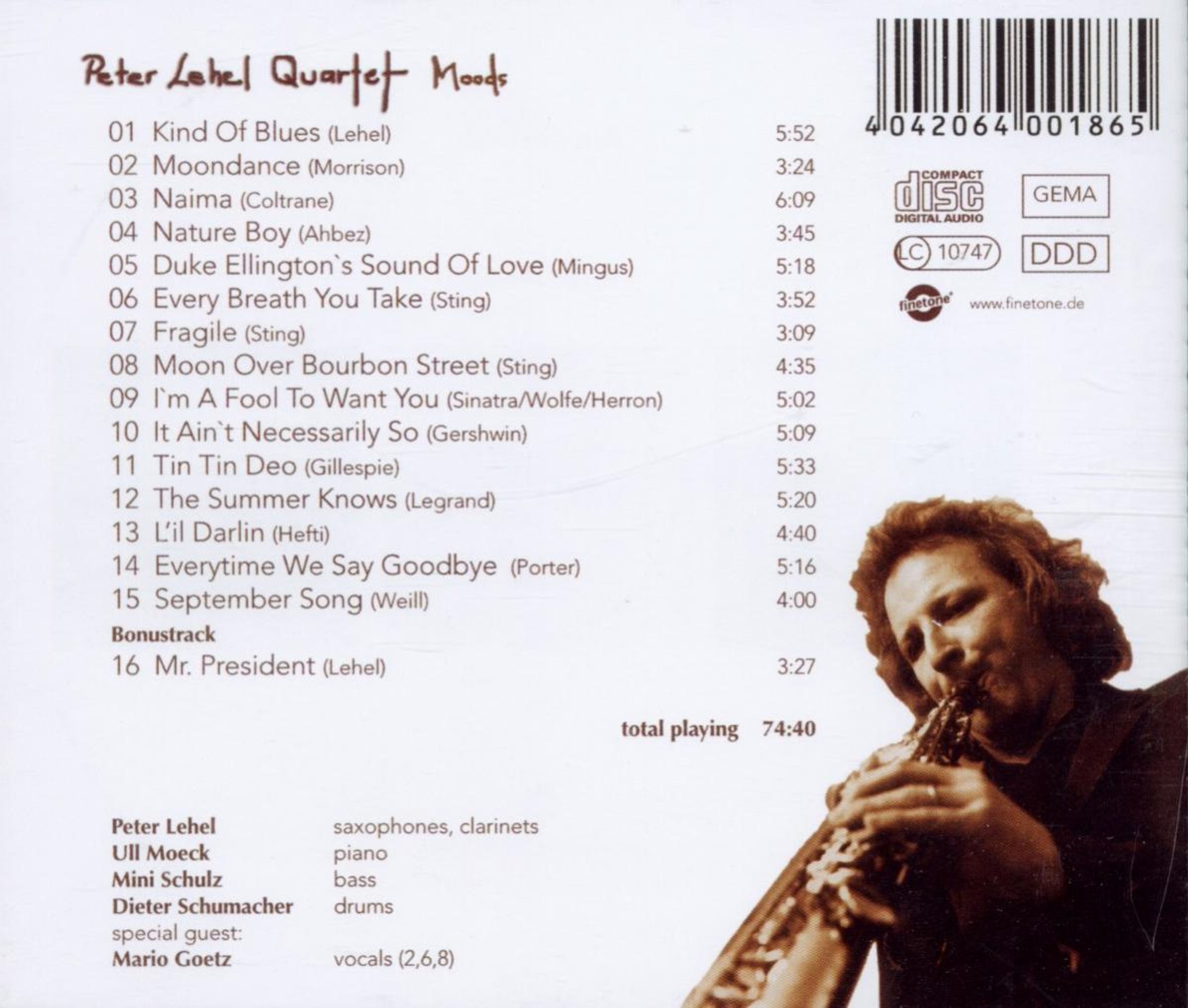 "Moods" lebt von den changierenden Stimmungen, die Peter Lehel mit seinen musikalischen Partnern Ull Moeck, Mini Schulz, Dieter Schumacher und der rauhen Stimme von Mario Goetz in den Gefilden von Blues, Balladenund dem "American Songbook" kreieren. Funkelnde Saxophon-Intros wechseln mit sanften Nachzeichnungen der Stimme "Stings" auf der Bassklarinette. Peter Lehels facettenreiche Intonation, sein konzentriertes Spiel kommt ohne forcierte Klangkaskaden ausund schafft damit die Stille, in der sich dem Zuhörer die "Moods" des ausgezeichneten Quartetts von Peter Lehel erschliessen.