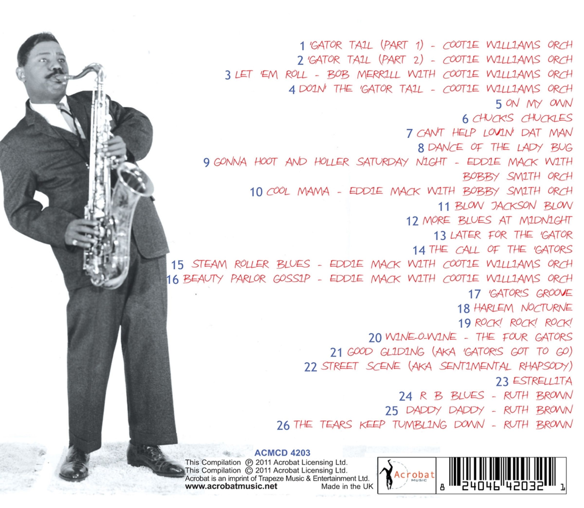 Although Willis “Gator Tail” Jackson never enjoyed a chart hit under his own name his honking saxophone graced many hits in the 40’s and 50’s. The tenor playing Jackson earned his nickname when a member of The Cootie Williams Orchestra for his hard blowing solos on Williams’s Jukebox hit – “Gator Tail”. He formed his own group whilst still playing with Williams and his screaming saxophone became a big attraction on Jukeboxes and live appearances during the early Fifties. He married R&B singer Ruth Brown and naturally worked with her both live and in the studio, examples of which round out this overview of the early years of one of the all time great tenor saxophonists.