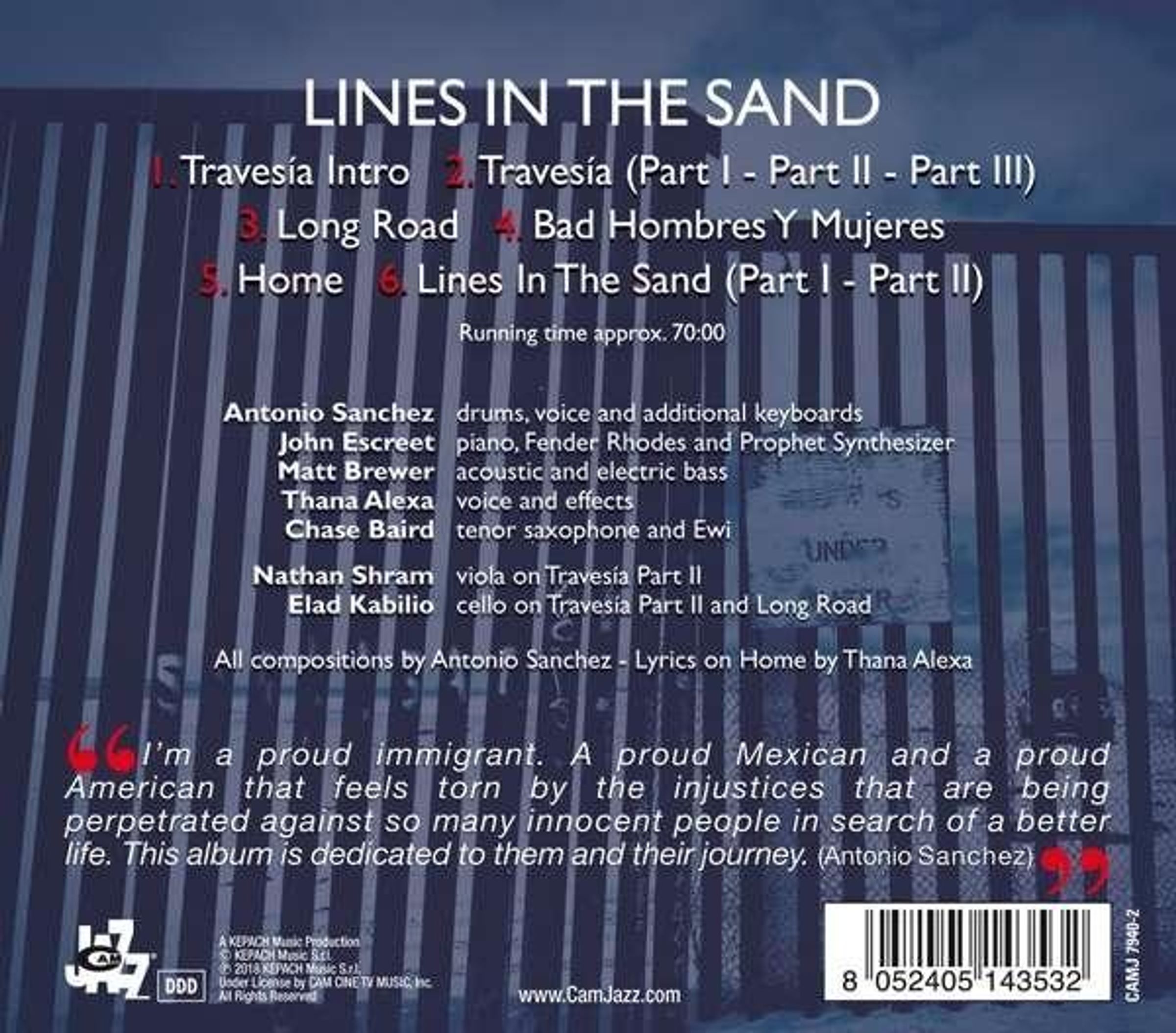 Das heutige Amerika hat den einstigen wechselseitigen und pragmatischen Beziehungen zu seinem südlichen Nachbarn Mexiko den Rücken gekehrt. Hass liegt in der Luft, und im Weißen Haus ist eine demagogische Stimme zu hören. Fast das Erste, was man auf Antonio Sanchez' kraftvollem neuen Album mit seiner Gruppe Migration hört, ist eine Stimme, die sagt: »Das ist falsch«, und eine andere, die ganz ruhig sagt: »Schäm dich!« Jazzmusik hatte schon immer ein Element des Protests, und »Lines In The Sand« ist ein hervorragendes Beispiel für Musik, die ihre Stärken ausspielt, ohne auch nur einen Bruchteil ihrer Musikalität aufzugeben.