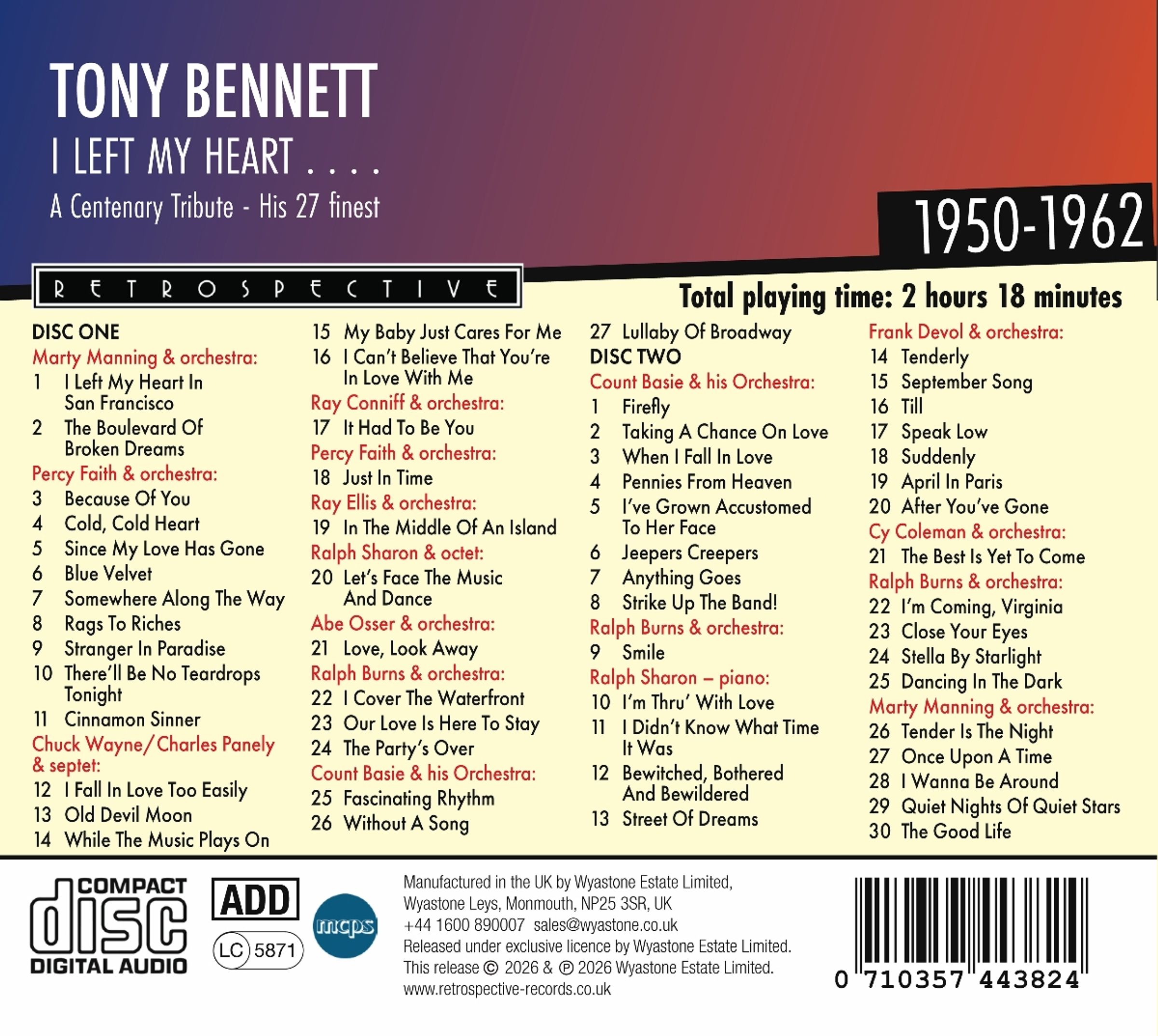 Ralph Burns, Ralph Sharon und vor allem dem Count Basie Orchester ("Jeepers, Creepers", "Strike Up The Band!"...). Er wurde auch zum vielleicht grossten Meister des Great American Songbook (z. B. "Speak Low", "Tenderly", "April In Paris" . . .). Und naturlich ist da sein dreifacher Triumph von 1962 mit "I Wanna Be Around", "The Good Life" und der absolutenTony-Bennett-Erkennungsmelodie "I Left My Heart In San Francisco".