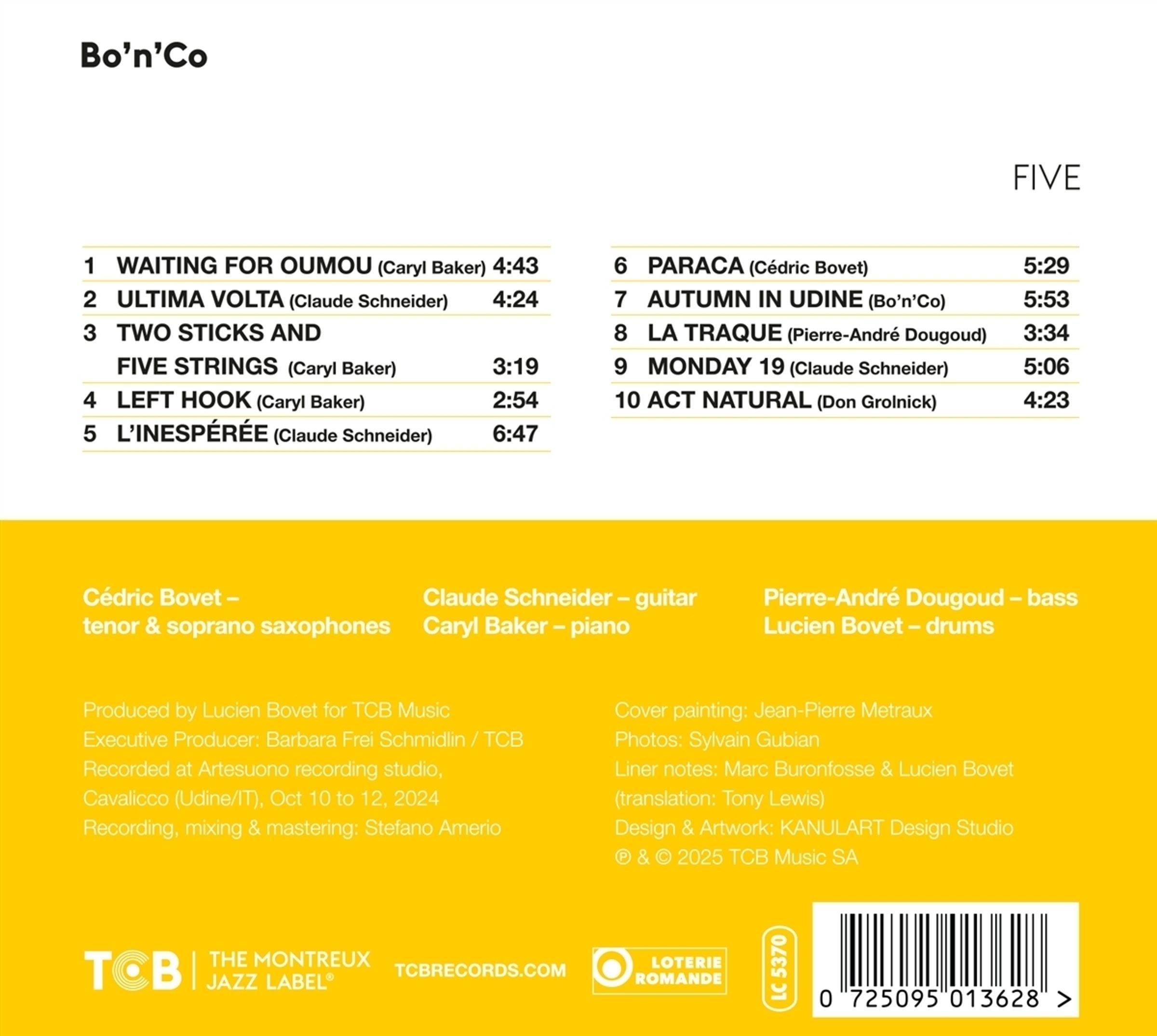 Mit Five" lädt uns BonCo zu einer klanglichen Reise ein, die uns mit jeder Komposition in verschiedene Facetten des zeitgenössischen Jazz entführt. Das Album spielt mit der Kreativität der einzelnen Musiker und umfasst zehn Titel, von denen jeder seine eigene Identität hat. Dennoch spiegeln sie alle den kollektiven Einfluss der Bandmitglieder wider, deren Zusammenhalt schon beim ersten Hören offensichtlich wird. Mit großem Einfallsreichtum demonstrieren die fünf Bandmitglieder eine