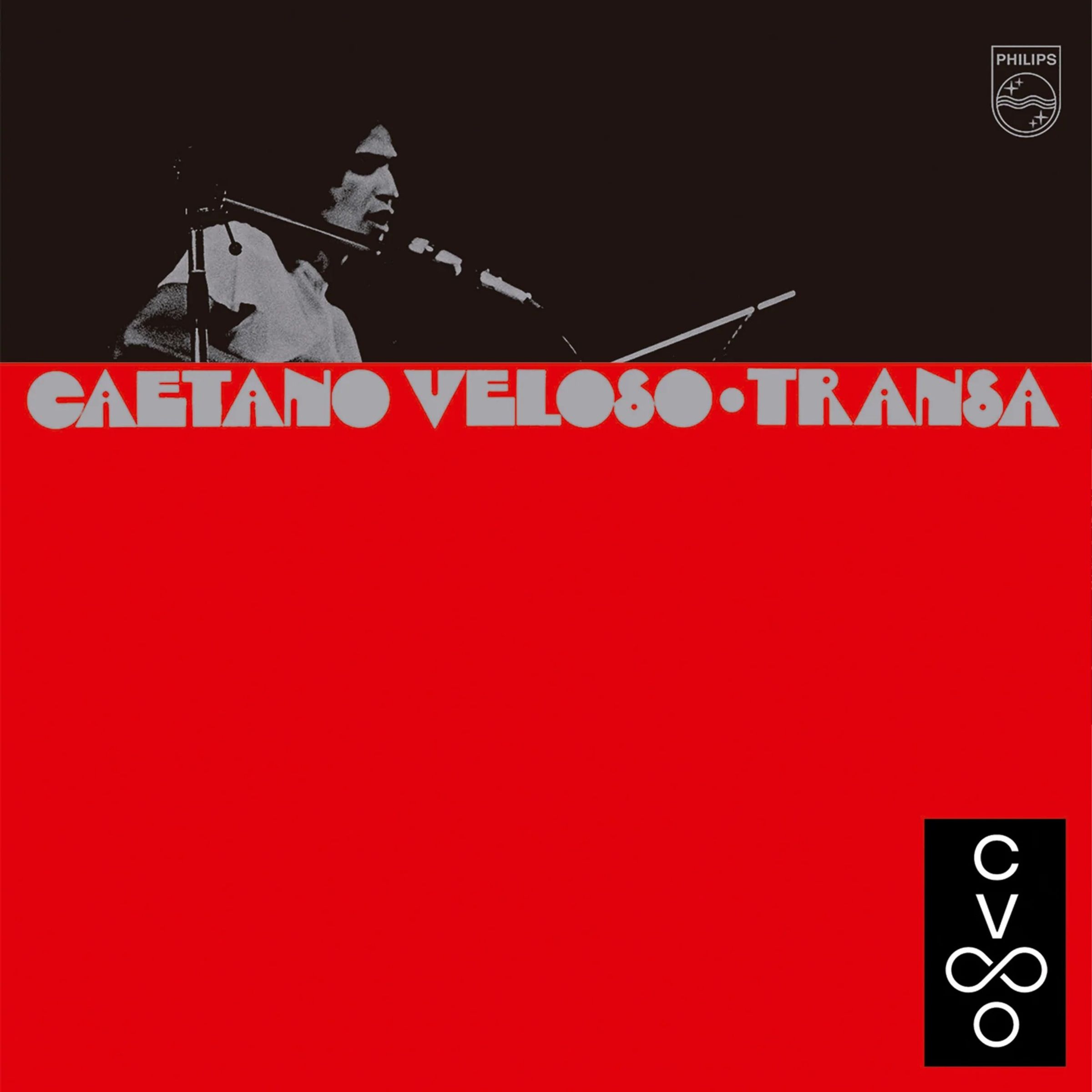 "CAETANO VELOSO - TRANSA" steht auf einem Cover mit rotem Bereich, darüber ein Schwarz-Weiß-Foto eines Musikers am Mikrofon., LP