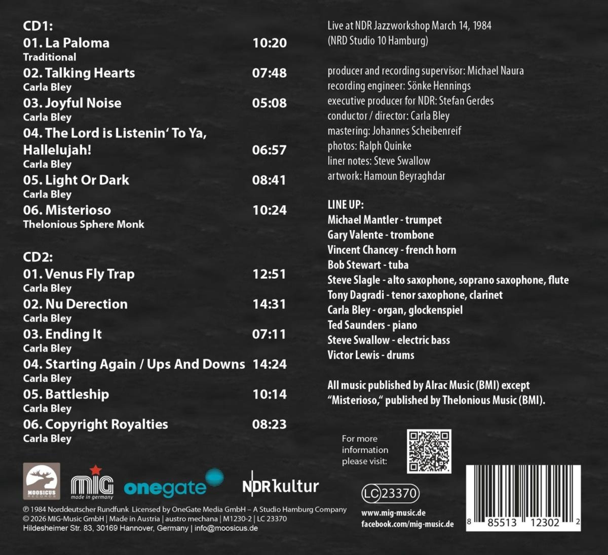 und ironische Elemente führte dies zu einer einzigartigen Klangästhetik in ihrem Soundkosmos. Am 14. März 1984 war die Carla Bley Band im damaligen Studio 10 des Norddeutschen Rundfunks zu Gast. Zum zehnköpfigen Ensemble gehörten auch Carlas Ehemann Michael Mantler sowie der Bassist Steve Swallow, der sich noch gut an den Frühlingstag in Hamburg erinnert: "Dies ist eine großartige Live-Aufnahme. Michael Naura, der sich seit vielen Jahren beim NDR für den Jazz einsetzte, war ein toller