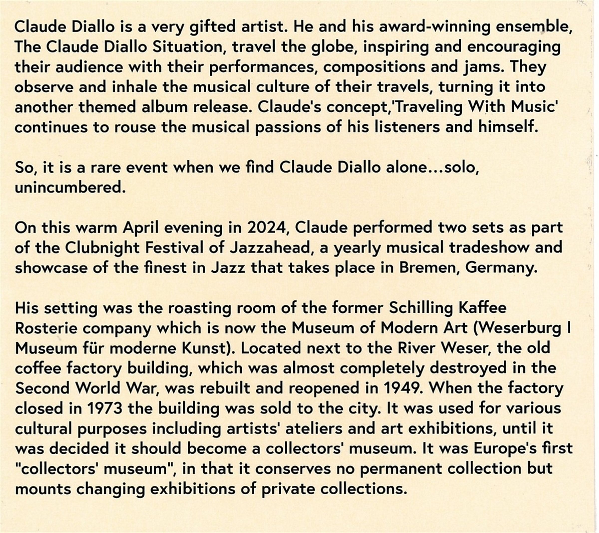 Claude Diallo ist seit mehr als 30 Jahren eine feste Größe im europäischen Jazz. Bei »Alone Finally« handelt es sich um ein Solo-Album mit bekannten Stücken anderer Musiker wie Keith Jarrett oder Cole Porter sowie Eigenkompositionen.