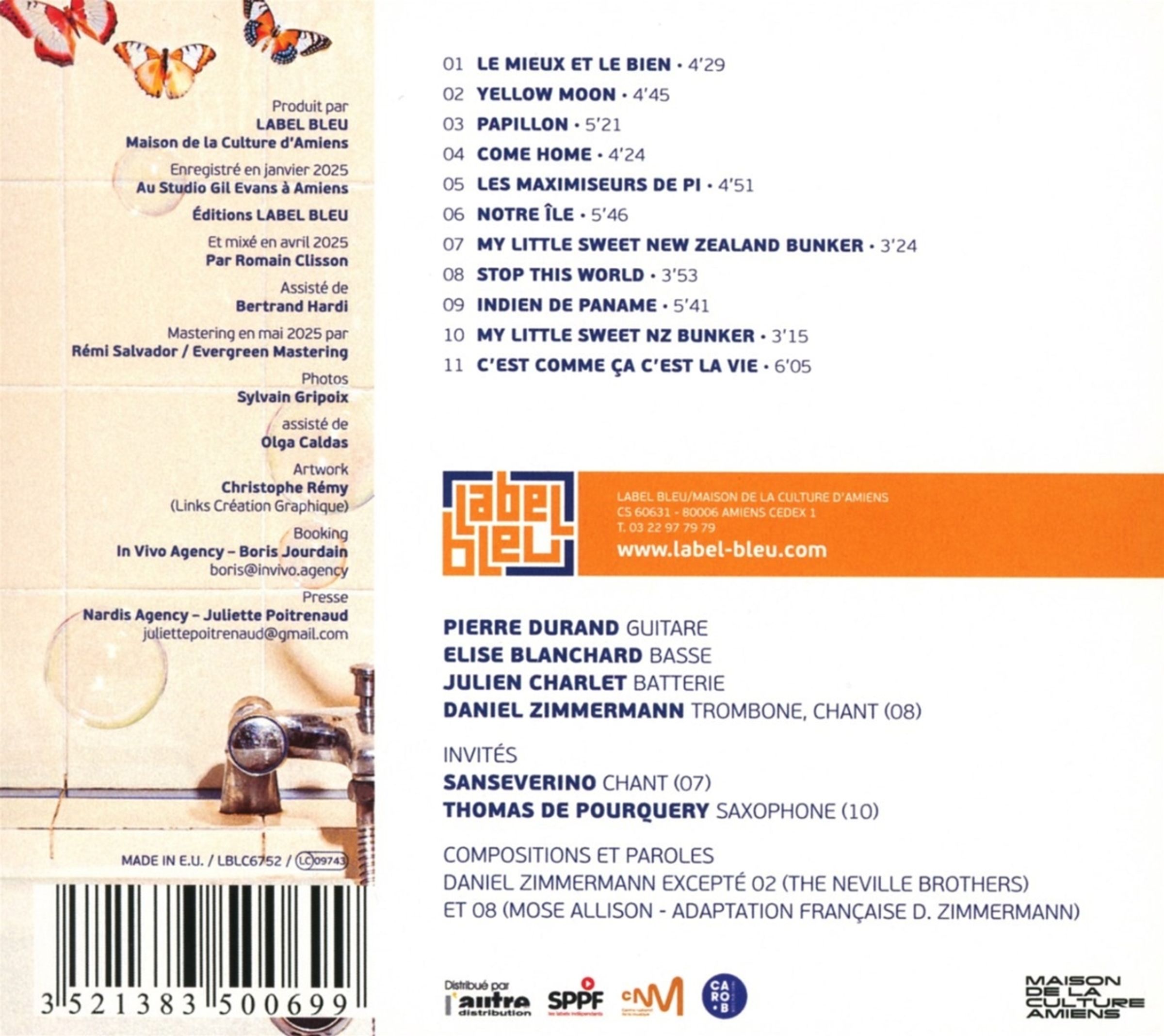 Zwischen der Unaufhaltsamkeit des Klimawandels, gesellschaftlichen Krisen und alltäglichen Absurditäten entsteht ein Werk, das die Irrwege unserer Zeit reflektiert – mal wie im späten Römischen Reich, mal wie in den 1930ern, manchmal sogar wie am Ende einer ganzen Ära. Zimmermann bleibt dabei frei von Pathos oder moralischem Zeigefinger: Er liefert einen klaren, ironisch-desillusionierten Blick auf Entwicklungen, die ihn wie uns alle betreffen. Unterstützt wird er von hochkarätigen Gästen: Sanseverino verleiht der gesungenen Version von »My Little Sweet NZ Bunker« seine unverwechselbare Stimme, während Thomas de Pourquery auf dem Saxofon das instrumentale Gegenstück veredelt. Das energiegeladene Kerntrio mit Julien Charlet und Pierre Durand wird durch die groovende Bassistin Élise Blanchard erweitert – ein bewusst gesetzter Kontrast, der Zimmermanns Fokus auf Komposition und facettenreiche Produktion unterstreicht.