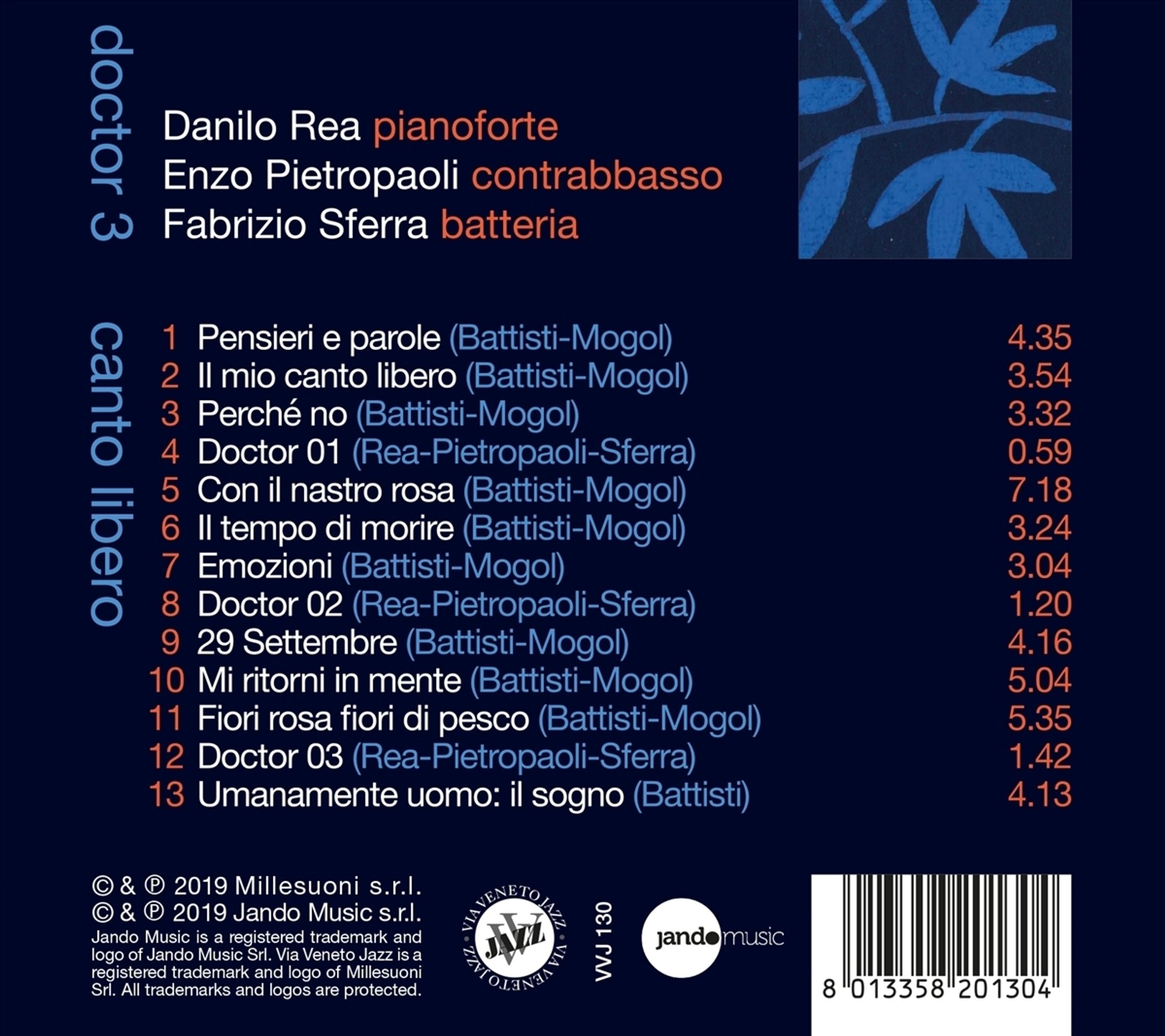 „Canto Libero“ heißt das neueste Album von Doctor 3, einer Formation aus drei der gefragtesten italienischen Jazzmusiker der letzten zwei Jahrzehnte: DANILO REA am Klavier, ENZO PIETROPAOLI am Kontrabass und FABRIZIO SFERRA am Schlagzeug. Ihre künstlerische Erfahrung und Reife gibt ihnen die Freiheit und den Mut, die Songs eines der einflussreichsten italienischen Popmusiker neu zu interpretieren und ihnen einen eigenen Klang zu verleihen. Die Rede ist von LUCIO BATTISTI, einer der einflussreichsten und innovativsten Figuren der italischen „Musica Leggera“, von der sich Musiker aus aller Welt bis heute inspirieren lassen.