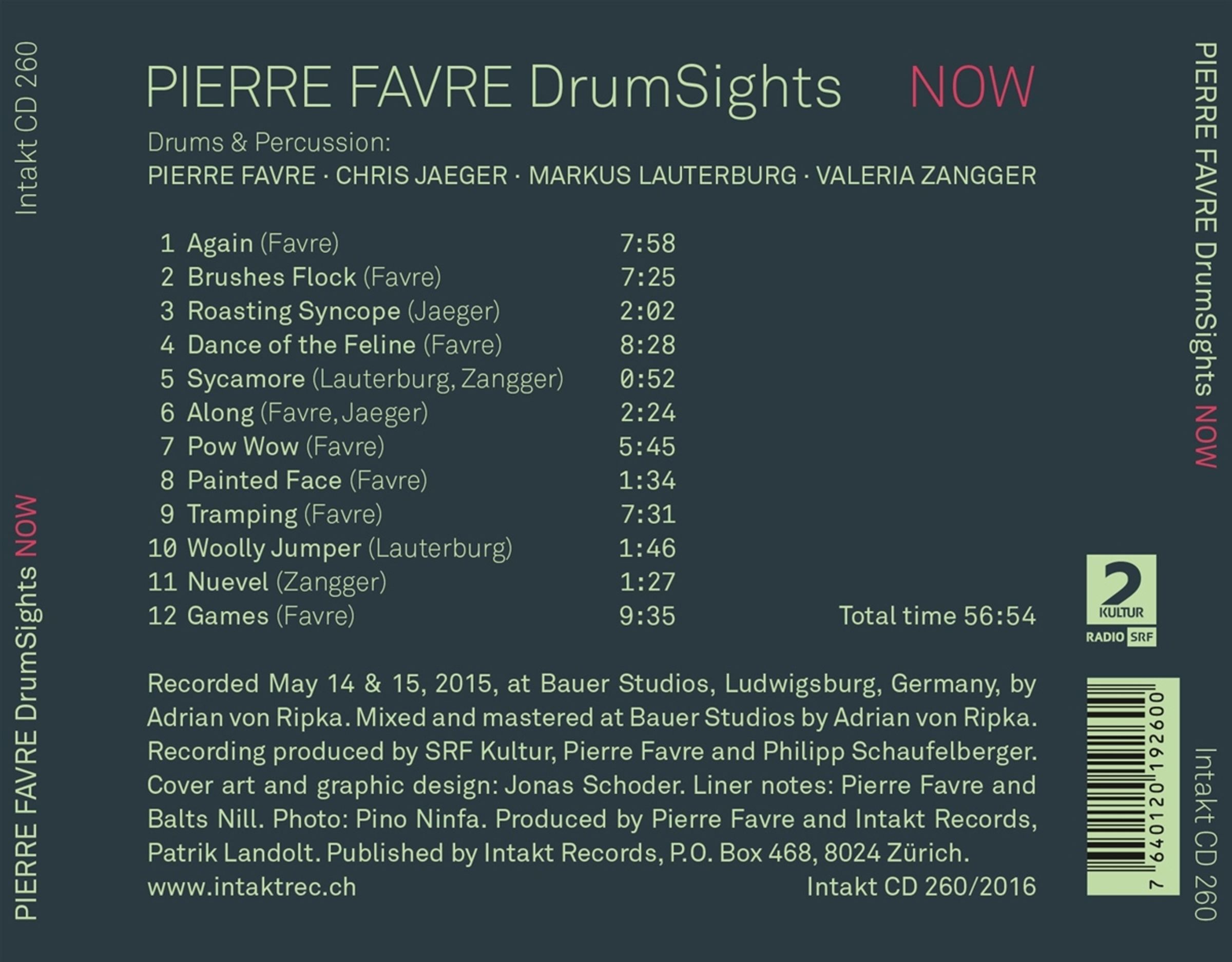 Über fünf Jahre hinweg arbeitete Favre mit drei herausragenden Schweizer Schlagzeugern der jüngeren Generation an dem Album ›Pierre Favre DrumSights, Now«: Chris Jaeger, Valeria Zangger und Markus Lauterburg. Obwohl die meisten Stücke exakt komponiert sind, werden sie auswendig gespielt – eine Leistung, die Favre mit Stolz hervorhebt. Seine Bemerkung unterstreicht die Spielfreude des Ensembles: ›Und die komplexesten und riskantesten Teile spielen wir mit einem Lächeln.‹