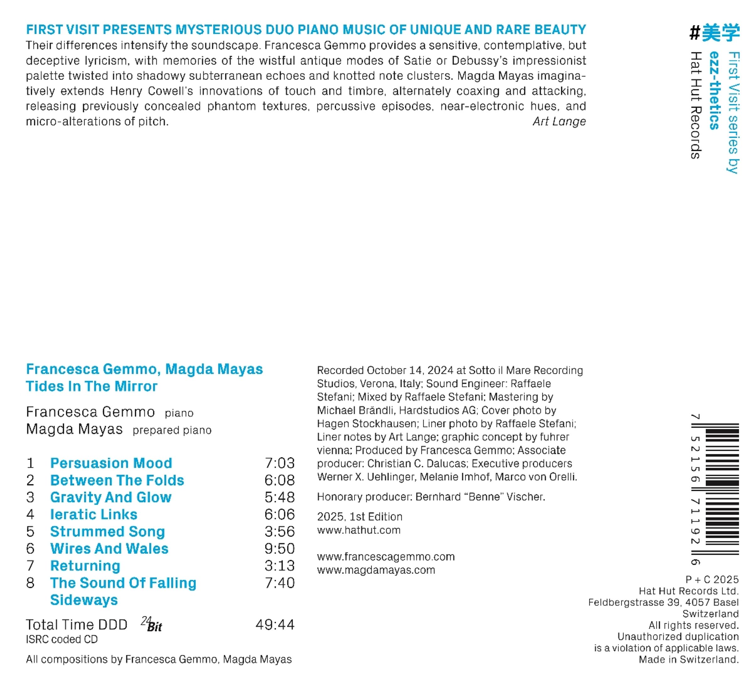 Ihre Unterschiede intensivieren die Klanglandschaft. Francesca Gemmo sorgt für eine einfühlsame, kontemplative, aber trügerische Lyrik, mit Erinnerungen an die wehmütigen antiken Modi von Satie oder Debussys impressionistischer Palette, die sich zu schattenhaften unterirdischen Echos und verknoteten Notenclustern verdrehen. Magda Mayas erweitert auf fantasievolle Weise Henry Cowells Innovationen in Bezug auf Anschlag und Klangfarbe, indem sie abwechselnd schmeichelt und attackiert und zuvor verb
