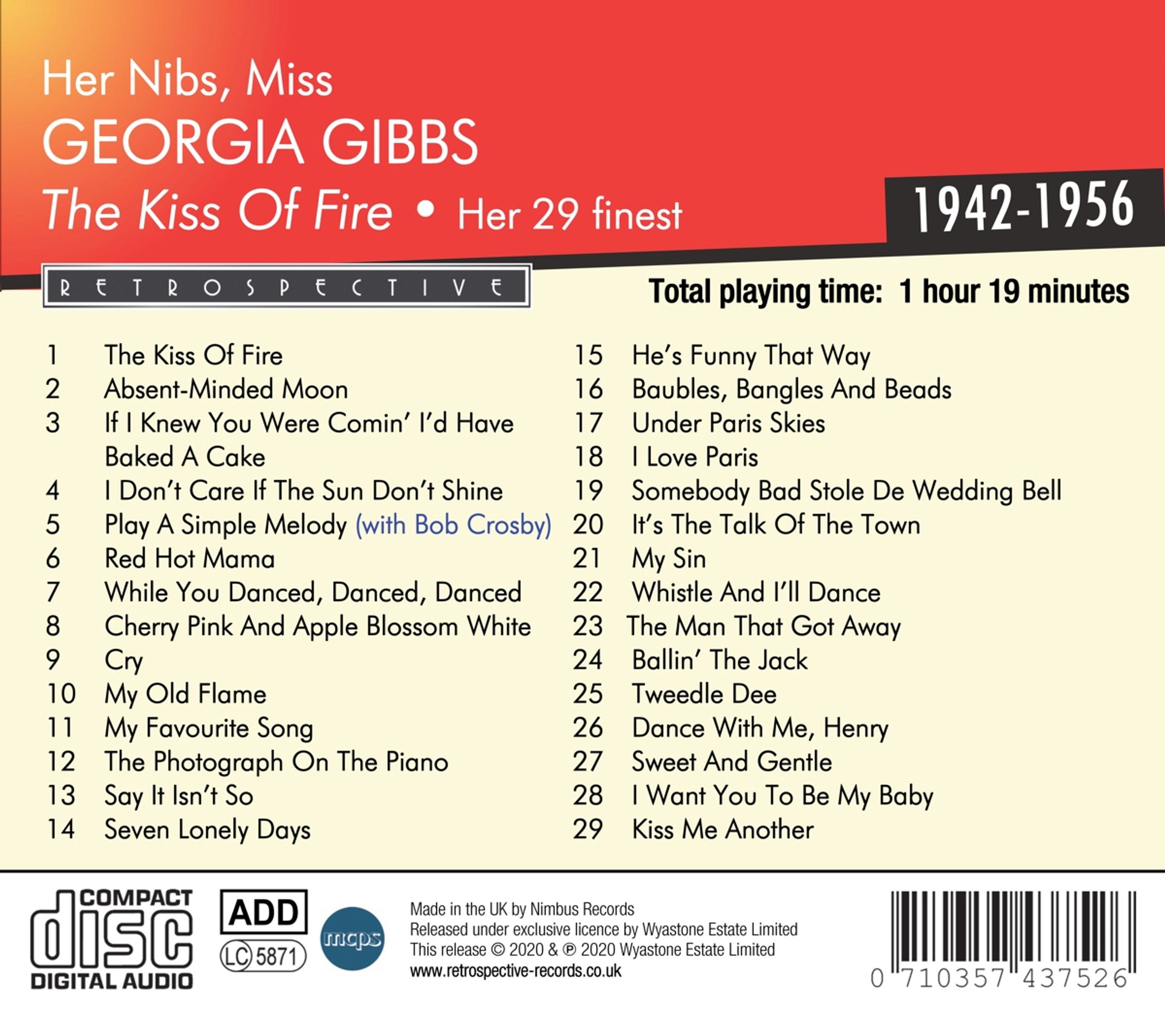 Georgia Gibbs wurde erstmals in Jimmy Durantes Show als »Her Nibs, Miss Gibbs« vorgestellt, wie sie auch in der Überschrift von »The Kiss Of Fire« steht, Retrospectives erlesener Auswahl von 29 Titeln aus ihren besten Jahren. Sie hatte sechs Top-6-Hits (alle inklusive), drei davon Millionenseller: das auf argentinischem Tango basierende »The Kiss Of Fire« von 1952 und ihre beiden R&B-»White-Cover« von 1955, »Tweedle Dee« und »Dance With Me, Henry«.
