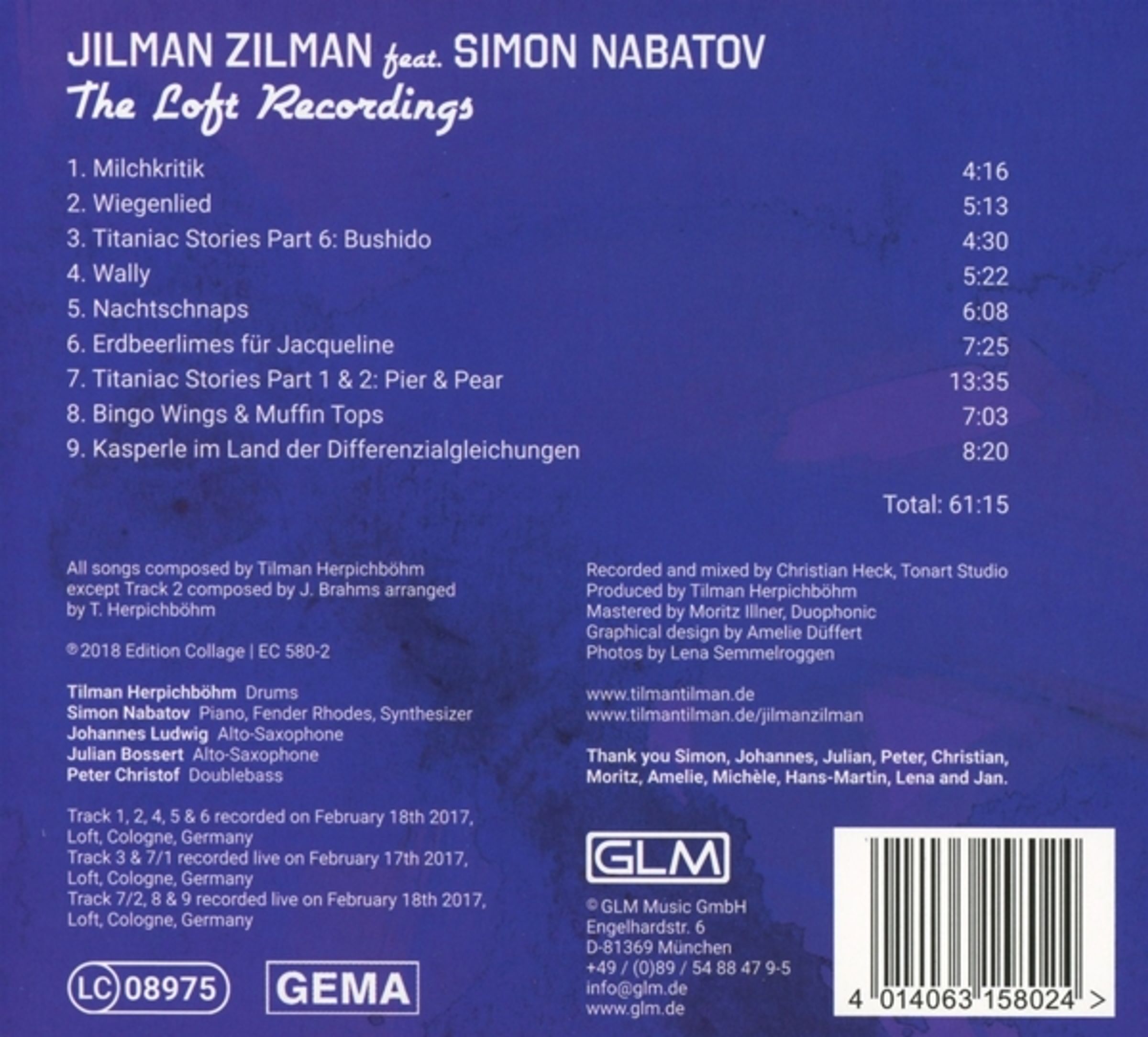 Dort können sich die Altsaxophone klanglich begegnen, um sich im nächsten Moment wieder vollständig zu entfremden – sie sind das Aushängeschild der Band. Simon Nabatov ist neu in der Crew, nach gemeinsamen Konzerten hat Tilman Herpichböhm die Stücke speziell für ihn geschrieben und ihn so zu einem Teil von Jilman Zilman gemacht. Er bringt frischen Wind in die Band – neu und verspielt werden gemeinsam kompositorische und improvisatorische Möglichkeiten erforscht.