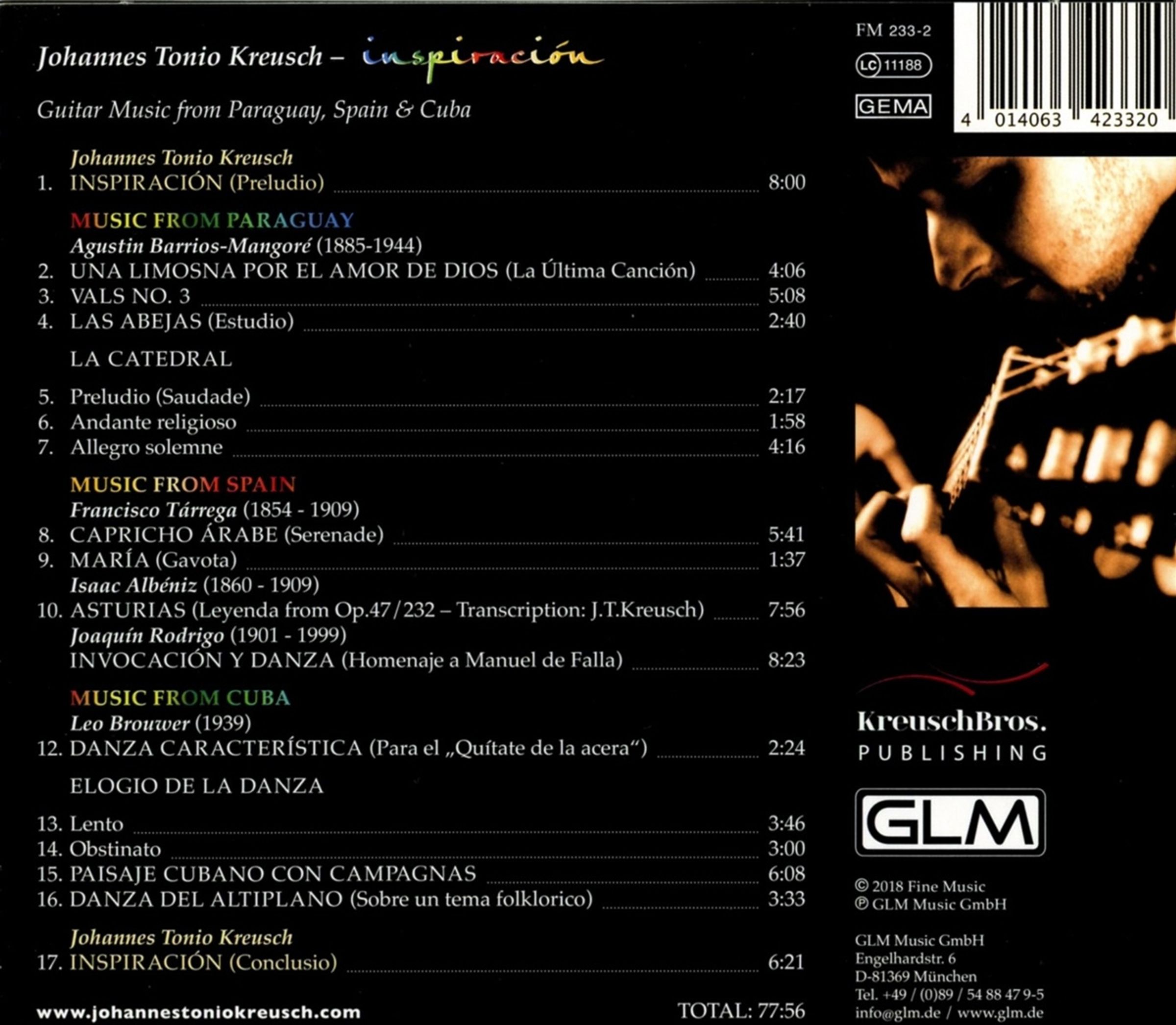 Zeitgleich mit der CD »Tangos & Canciones« wird Johannes Tonio Kreuschs erfolgreiches Solo-Album »Inspiración« wiederveröffentlicht. Die ursprünglich auf dem BMG-Label Arte Nova im Jahre 2001 erschienene CD ist hiermit remastered wieder erhältlich. Die auf dieser Einspielung zu hörenden berühmten Meisterwerke von Barrios-Mangoré, Tárrega, Albéniz, Rodrigo und Brouwer haben schon viele Gitarrenliebhaber begeistert und sind alle zutiefst inspiriert von den sechs schwingenden Saiten der spanischen Gitarre. Umrahmt wird dieses persönliche Album von zwei Improvisationen des Interpreten.