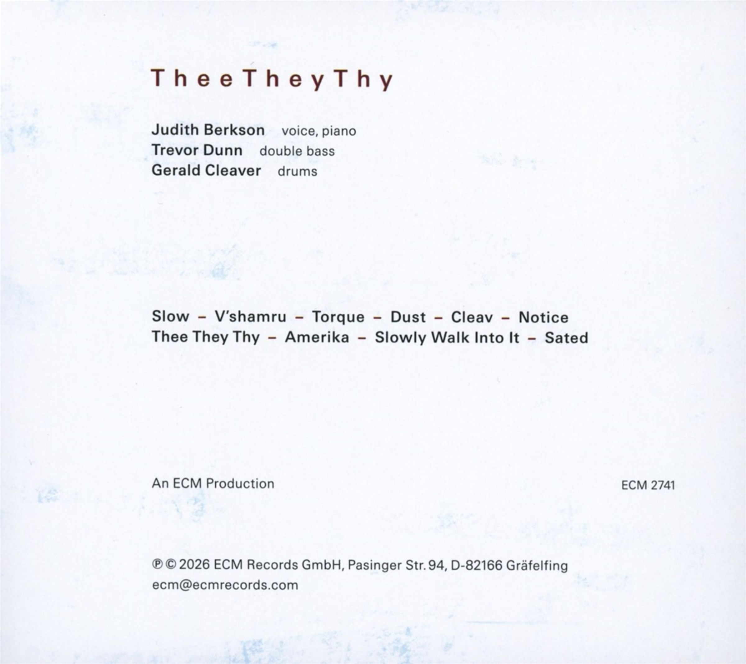 Nach Oylam (2010) kehrt Mezzosopranistin, Pianistin, Komponistin und Improvisatorin Judith Berkson mit einem weiteren unkategorisierbaren und auf eigenständigste Weise fesselnden künstlerischen Epos zurück. Auf Thee They Thy führt sie ein Trio mit Trevor Dunn und Gerald Cleaver durch ein radikal wechselndes Programm, das sich neuen Vertonungen von Gebetsgesängen widmet (Berkson ist auch Kantorin), ebenso wie eigenen Stücken, vokalen Experimenten, improvisiertem Triozusammenspiel und weitere idiomatische Brücken schlägt.