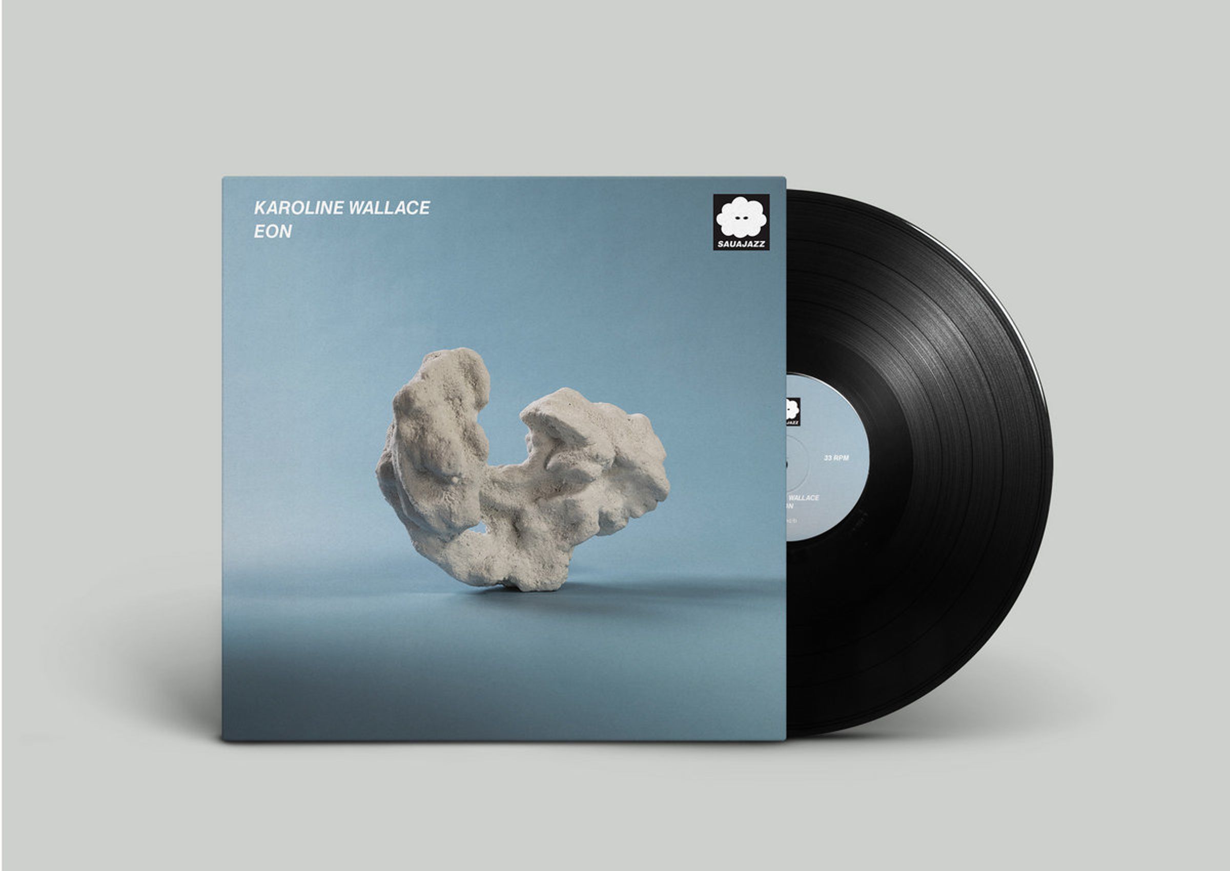 Text: "KAROLINE WALLACE EON". Schallplattenhülle in Blau mit einem abstrakten, hellen Steinelement. Schallplatte rechts sichtbar., LP