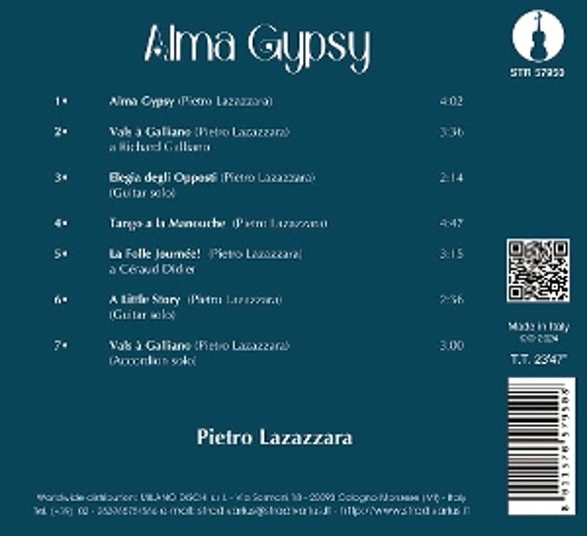 Das dritte Album des Jazz-Gitarristen Pietro Lazazzara "Alma Gypsy" spiegelt seine personliche Vision des Gypsy-Stils wider. Mit der neuen Sammlung bisher unver÷ffentlichter Eigenkompositionen hat er sein musikalisches Spektrum erweitert und den Klang und die Spielweise der Manouche-Gitarre mit der Kraft des Flamenco, der Eleganz des Vals Musette und leidenschaftlichen, energiegeladenen Momenten in intimen und kontrastreichen Atmospharen