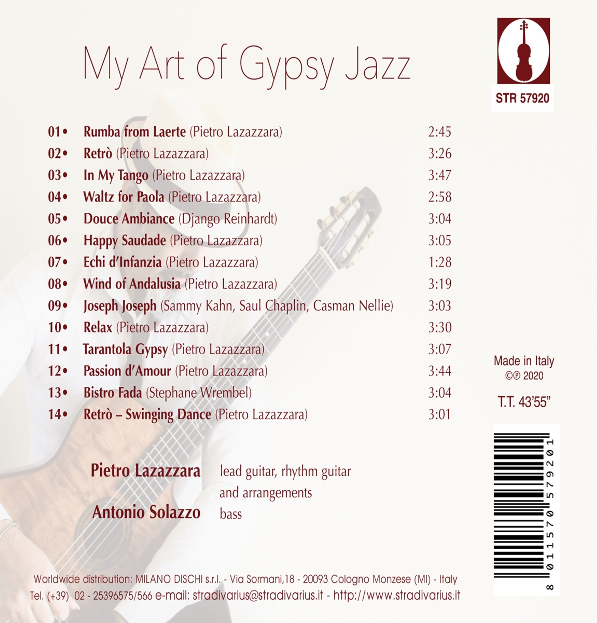 Pietro Lazazzara schreibt: »Das Werk ›My Art of Gypsy Jazz‹ besteht aus 14 Kompositionen. 11 Stücke sind Originalstücke, die nie veröffentlicht wurden, während 3 Stücke von Komponisten der Zigeunermusik geschaffen wurden. Der Titel des Albums bringt meine Vision des traditionellen Gipsy Jazz und seine mögliche Projektion in die Zukunft voll und ganz zum Ausdruck.