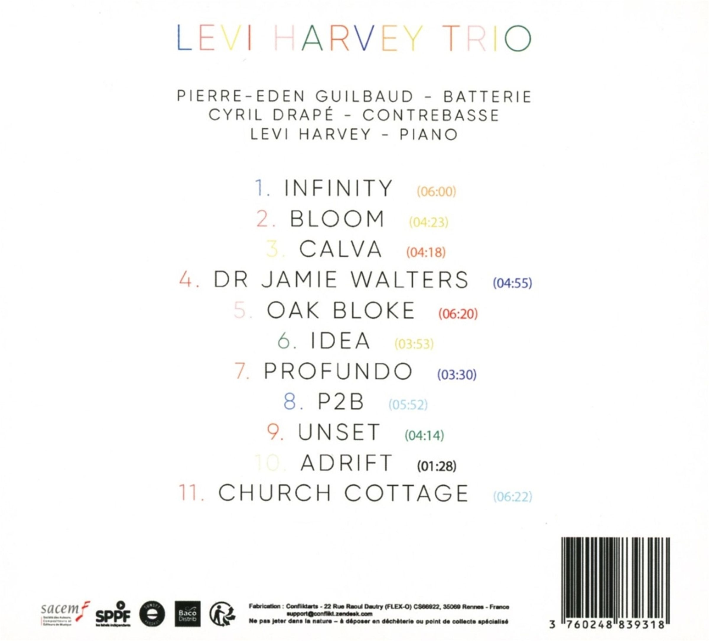 "LEVI HARVEY" oben links, "BLOOM" oben rechts. Bunte Kritzel-Linien in abstrakter Anordnung dominieren das Bild., CD