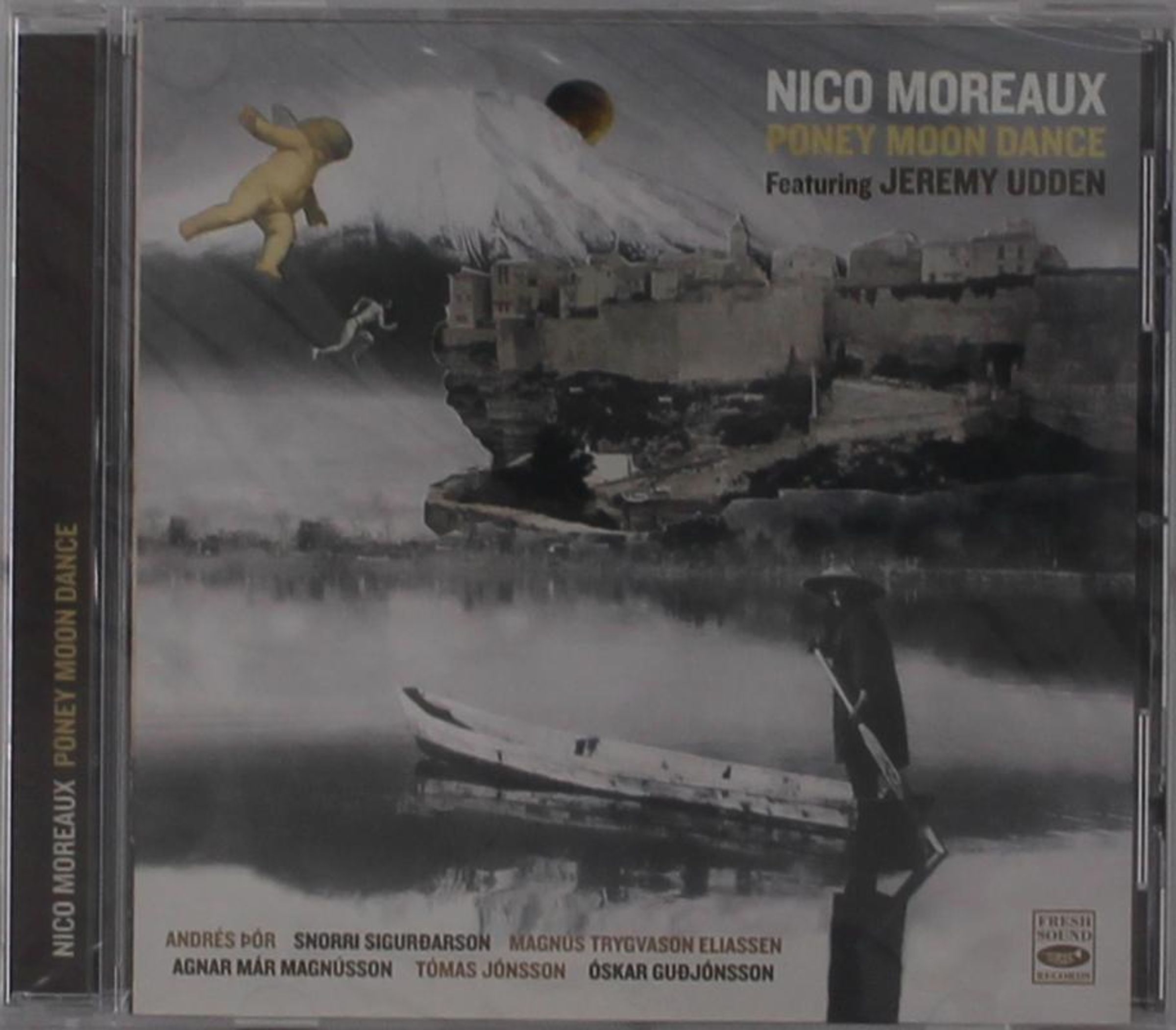 "NICO MOREAUX PONEY MOON DANCE Featuring JEREMY UDDEN" auf einem CD-Cover mit surrealem Stadt- und Landschaftsmotiv., CD