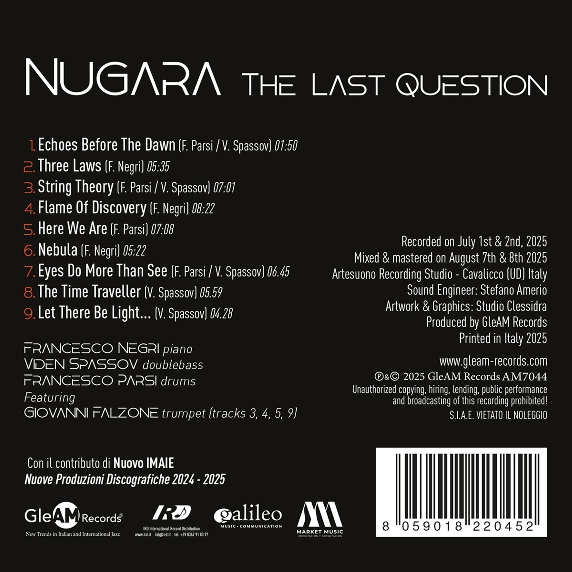 The Last Question, the second album by NUGARA, a trio formed by Francesco Negri (piano), Viden Spassov (double bass) and Francesco Parsi (drums). Guest on the album is trumpeter Giovanni Falzone. The album, produced by GleAM Records with the contribution of Nuovo IMAIE will be available on CD and digital download / streaming from November 28, 2025 and distributed by IRD International, Galileo Music, Site Music and Believe Digital. The release will be preceded by the singles String Theory